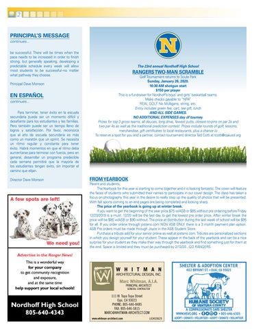 2 PRINCIPAL’S MESSAGE continues... be successful. There will be times when the pace needs to be increased in order to finish strong, but generally speaking, developing a predictable schedule every week will allow most students to be successful--no matter what pathway they choose. Principal Dave Monson