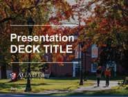In the downloaded PowerPoint file, you may replace the Acadia University logo on Slide 1 with a Department specific logo if applicable. Department/faculty logos are available on in the Brand and Communications Toolkit on Sharepoint. If a logo does not yet exist for your department and you need one created, contact the Acadia Brand Council (brandcouncil@acadiau.ca) for assistance.
