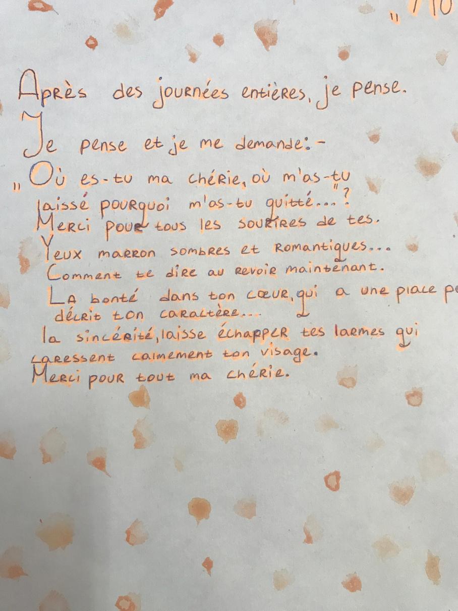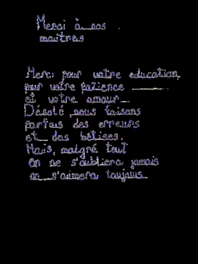Merci pour votre amitie. Merci pour votre respect. Vous etes formiadobles. Mot enfants est Joyeuse, quand nous sommes tous ensamble. Nous sommes la meilleure classe .