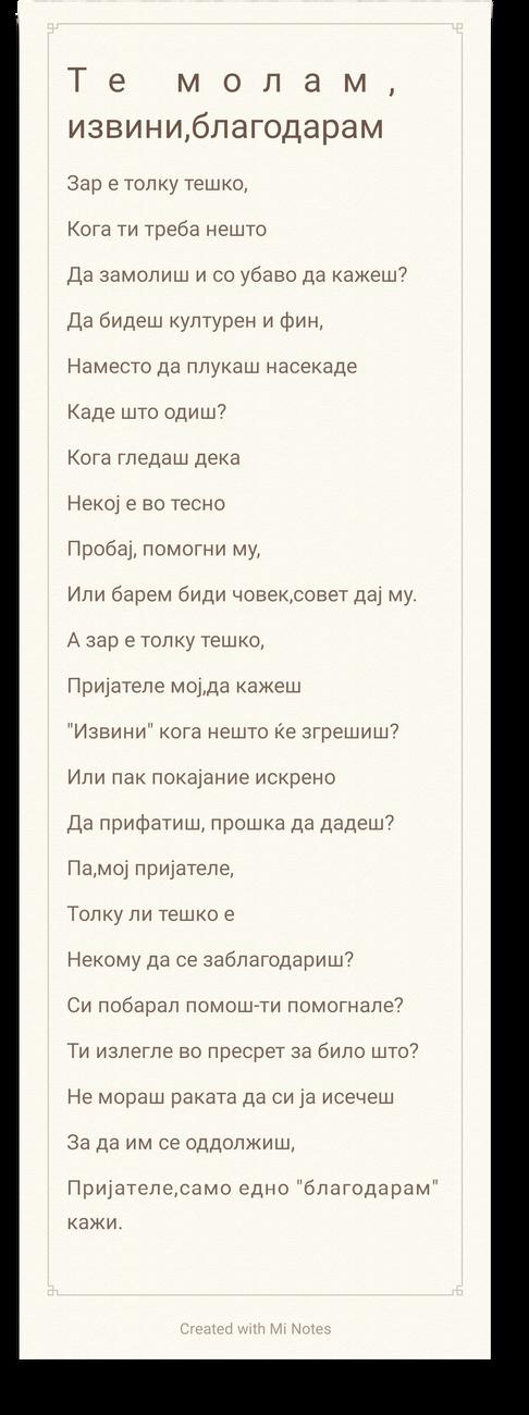 Дасебидедобарможедабидесеко акосака, даправидобриделаидаподаварака, нонекоимислатдекатоаетешкаиголемамака. Вездениграм, пеамипосто аносесмеам, аналуѓетопоулицитељубовтаим авеам. Темолам, извини, благодараммагичнизборовисе тие, итребадабидатделодсечиесеко дневие. Когабевмаламамапосто аномивелеше, топлизборовивосрцетомиделеше. Когадобивамнешто "благодарам'' дакажам, нечи денсигурноќеублажам. Когабарамнештотреба "темолам" даречам, сенадевамнеманикомудапречам. Насеко агрешкатребадасеизвинам, секогашподоброќебидеакоубавосеоднесувам. Учтивостаенештокоеотворасилнипорти, моќко аневодиконпатотнаживотот, инеучизанештазакоиникогашнесмезнаеле. Почитаидобринатасенаоѓавочовека, некадетукавонеговотосрце, срцетокоечукасамозаубавини, убавиникоинигоправатживототполесен МихаелаНачовска IX-2 одд