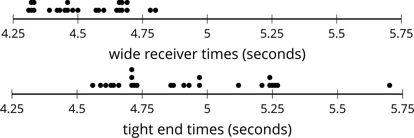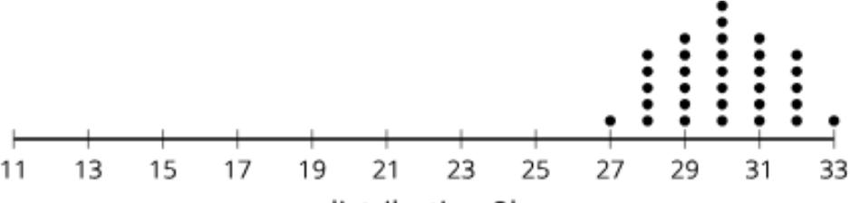 • «Una vez que recogiste tus datos, ¿cómo respondiste a tu pregunta estadística?». (Utilicé dos diagramas de puntos diferentes para mostrar mis datos y determiné que la media era la medida más apropiada del centro porque mi diagrama de puntos era aproximadamente simétrico. A continuación, calculé la desviación estándar con la tecnología porque es apropiado utilizarla con la media. A continuación, comparé la media y la desviación estándar de los dos conjuntos de datos y determiné que al estar parado sobre dos pies mi compañero reaccionaba ligeramente más rápido y mostraba menos variabilidad que al estar de pie sobre un pie).