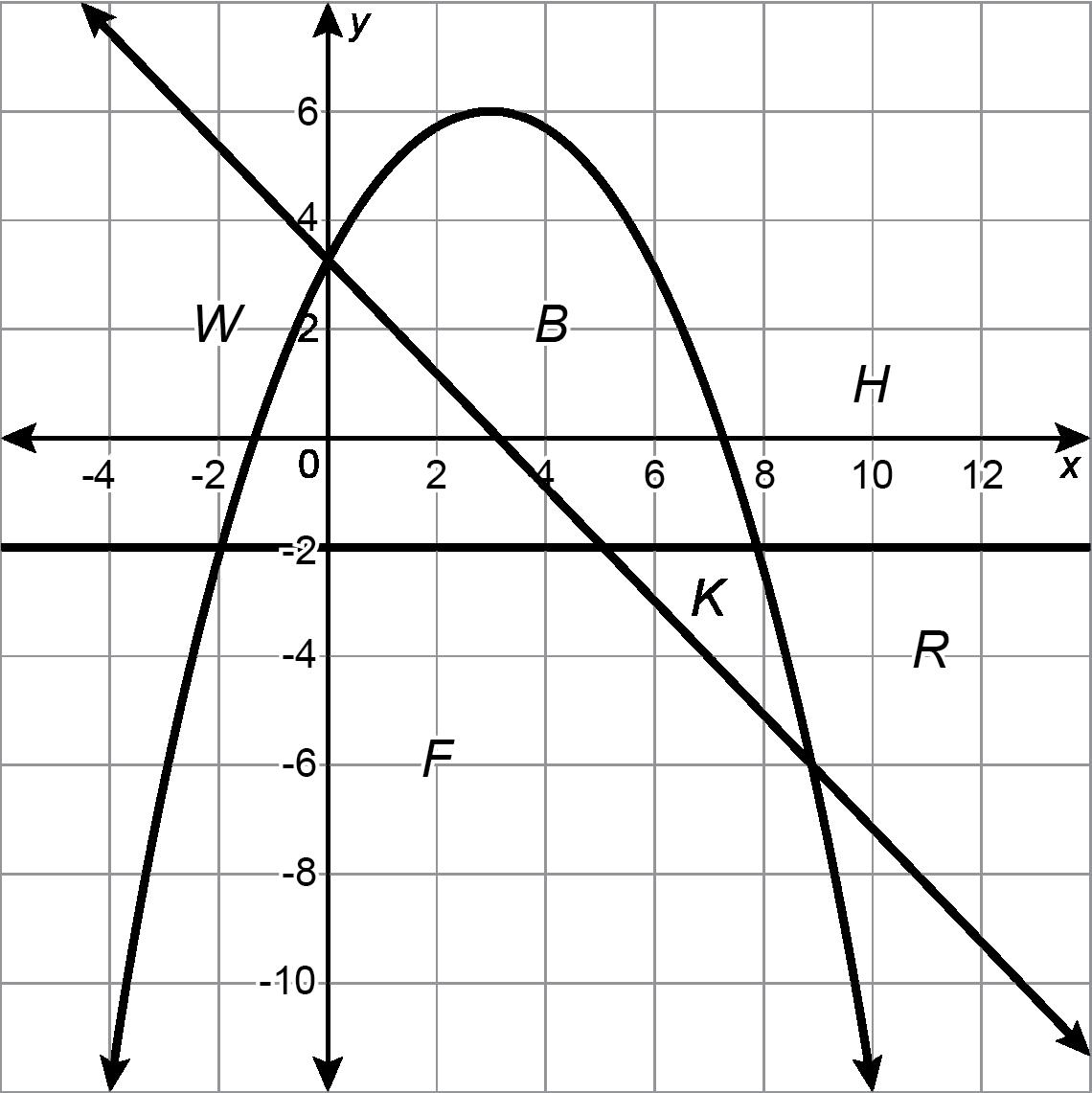 Se muestra un gráfico con seis regiones etiquetadas. Las regiones se formaron con las gráficas de las ecuaciones y = x2 3 + 2x + 3, y = −x + 3 y y = −2
