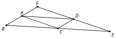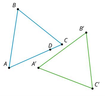 Noah comienza con el triángulo ABC y hace 2 nuevos triángulos trasladando B a A y trasladando B a C. Noah piensa que el triángulo DCA es congruente con el triángulo BAC. ¿Estás de acuerdo con Noah? Explica tu razonamiento.