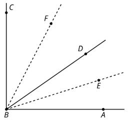 Las rectas AB y BC son perpendiculares. Los semirrectas discontinuos bisecan los ángulos ABD y CBD.