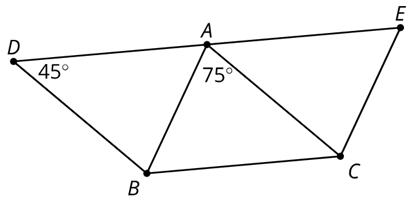 La medida del ángulo ACE es 75 grados ya que el triángulo CEA es congruente al triángulo ABC y la medida del ángulo CAB es 75 grados. La medida del ángulo EAC es 45 grados porque corresponde al ángulo D del triángulo BAD. Como la suma de los ángulos del triángulo CEA es 180 grados, esto significa que la medida del ángulo CEA es 60 grados.