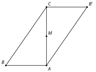 En este diagrama, el punto M es el punto medio del segmento AC y B′ es la imagen de B mediante una rotación de 180° alrededor de M