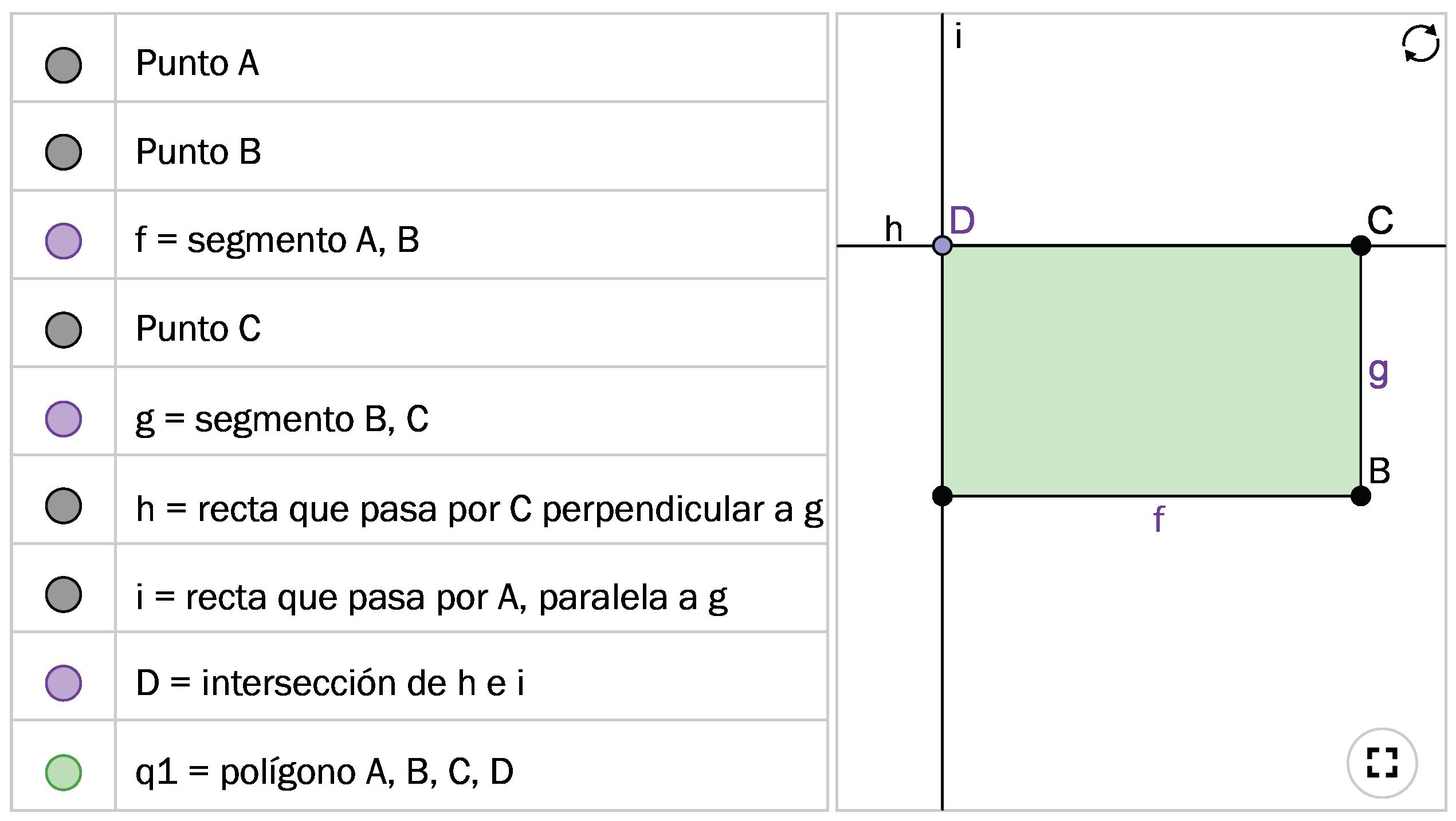 G-CO.12 Hacer construcciones geométricas formales con una variedad de herramientas y métodos (compás y regla, cuerda, dispositivos reflectantes, plegado de papel, programa geométrico dinámico, etc.). Copiar un segmento; copiar un ángulo; bisecar un segmento; bisecar un ángulo; construir líneas perpendiculares, incluyendo la bisectriz perpendicular de un segmento de línea; y construir una línea paralela a una línea dada a través de un punto que no está en la línea.