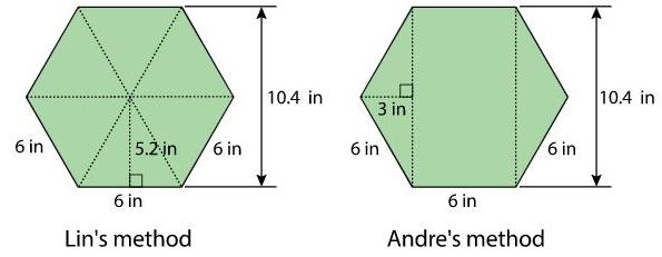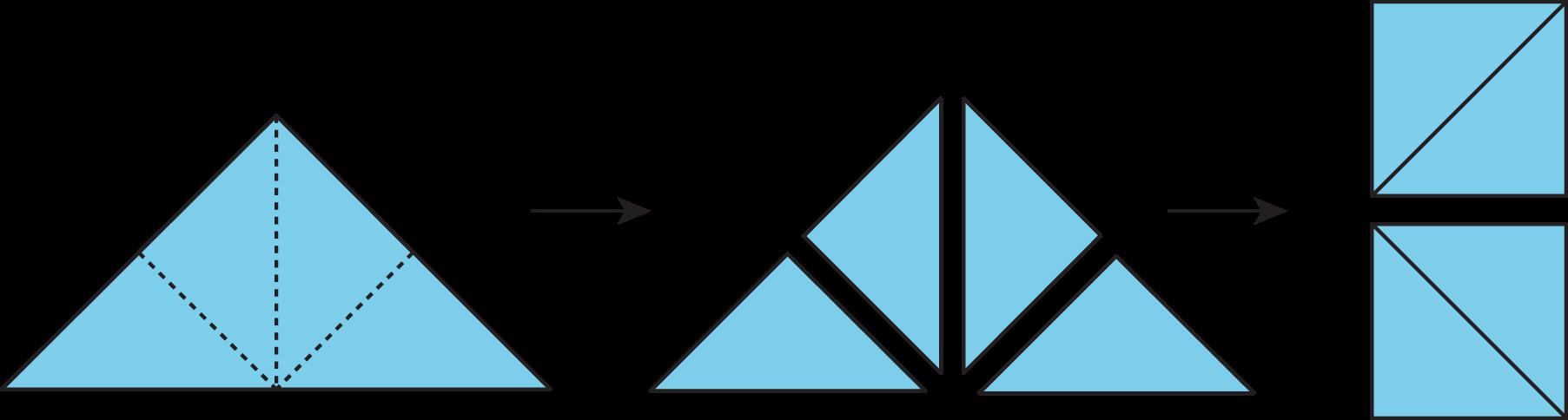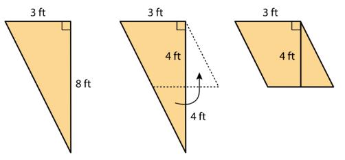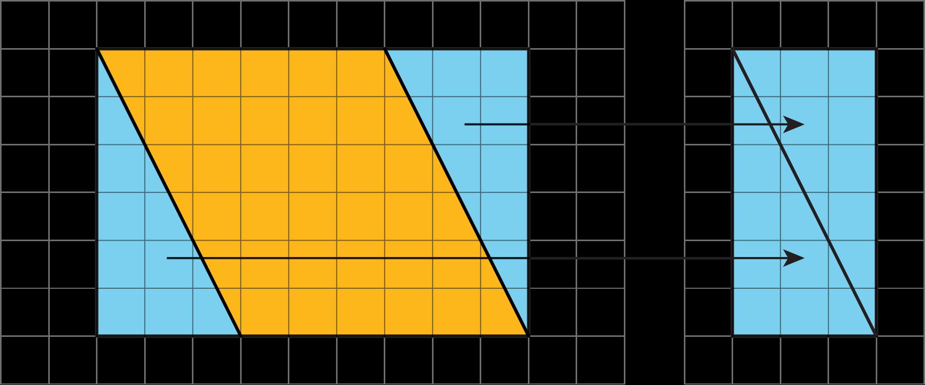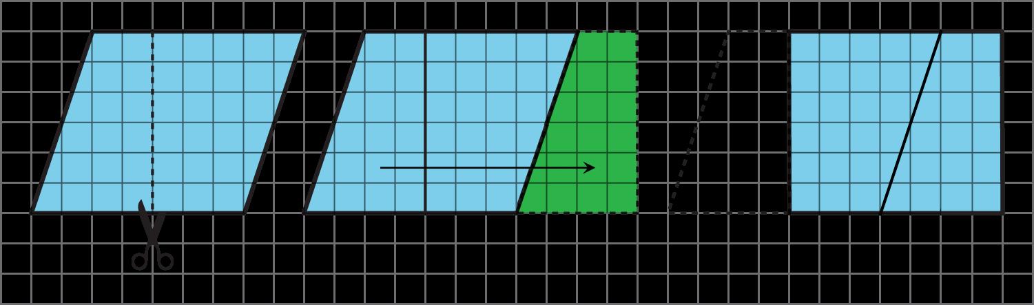 En 6.º grado, los estudiantes amplían su razonamiento sobre el área para incluir formas que no están compuestas por rectángulos. Para ello, aprovechan las habilidades desarrolladas en grados anteriores para componer y descomponer formas, por ejemplo, para ver un rectángulo como compuesto de dos triángulos rectángulos congruentes. Mediante actividades diseñadas y secuenciadas para permitir a los estudiantes dar sentido a los problemas y perseverar en su resolución (MP1), los estudiantes aprovechan estas habilidades y su conocimiento de las áreas de los rectángulos para hallar las áreas de los polígonos descomponiéndolos y reordenándolos para hacer figuras cuyas áreas pueden determinar (MP7). Aprenden estrategias para hallar áreas de paralelogramos y triángulos, y usan la regularidad en razonamientos repetidos (MP8) para desarrollar fórmulas para estas áreas, usando propiedades geométricas para justificar la corrección de estas fórmulas. Utilizan estas fórmulas para resolver problemas. Comprenden que cualquier polígono puede descomponerse en triángulos y utilizan este conocimiento para hallar áreas de polígonos. Calculan las áreas de poliedros con superficies triangulares y rectangulares. Estudian, ensamblan y dibujan redes de poliedros y las utilizan para determinar sus áreas superficiales. A lo largo de todo el proceso, discuten sus ideas matemáticas y responden a las ideas de los demás (MP3, MP6).