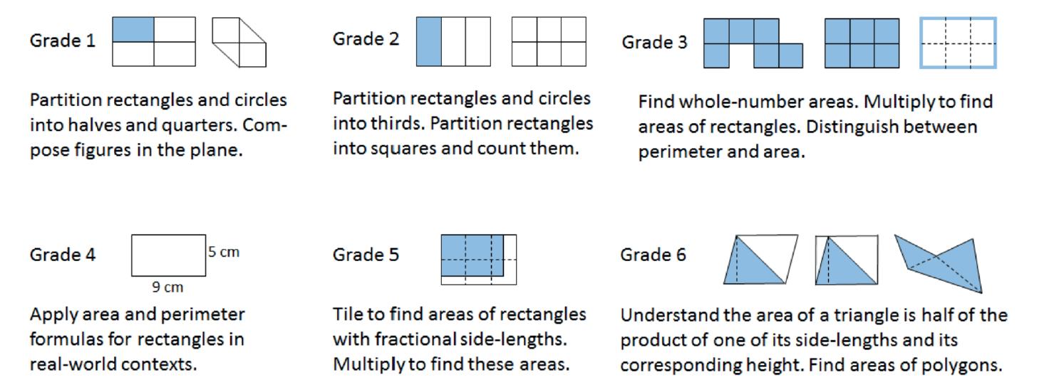El trabajo con el área en 6.º grado se basa en el trabajo previo con la geometría y la medida geométrica. Los estudiantes empezaron a aprender sobre formas bidimensionales y tridimensionales en el jardín de infancia y continuaron este trabajo en 1.º y 2.º grado, componiendo, descomponiendo e identificando formas. El trabajo de los estudiantes con las medidas geométricas comenzó con la longitud y continuó con el área. Los estudiantes aprendieron a estructurar el espacio bidimensional, es decir, a ver un rectángulo con longitudes laterales de números enteros como compuesto por un conjunto de cuadrados unitarios o compuesto por filas iteradas o columnas iteradas de cuadrados unitarios. En 3.º grado, los estudiantes distinguen entre perímetro y área. Relacionaron el área de un rectángulo con la multiplicación, entendiendo por qué (para longitudes laterales enteras) multiplicando las longitudes laterales de un rectángulo se obtiene el número de cuadrados unitarios que forman el rectángulo. Utilizaron diagramas de área para representar casos de la propiedad distributiva. En 4.º grado, los estudiantes aplicaron las fórmulas de área y perímetro de rectángulos para resolver problemas matemáticos y de la vida real y aprendieron a utilizar transportadores. En 5.º grado, los estudiantes ampliaron la fórmula del área de rectángulos a rectángulos con lados de longitud fraccionaria.
