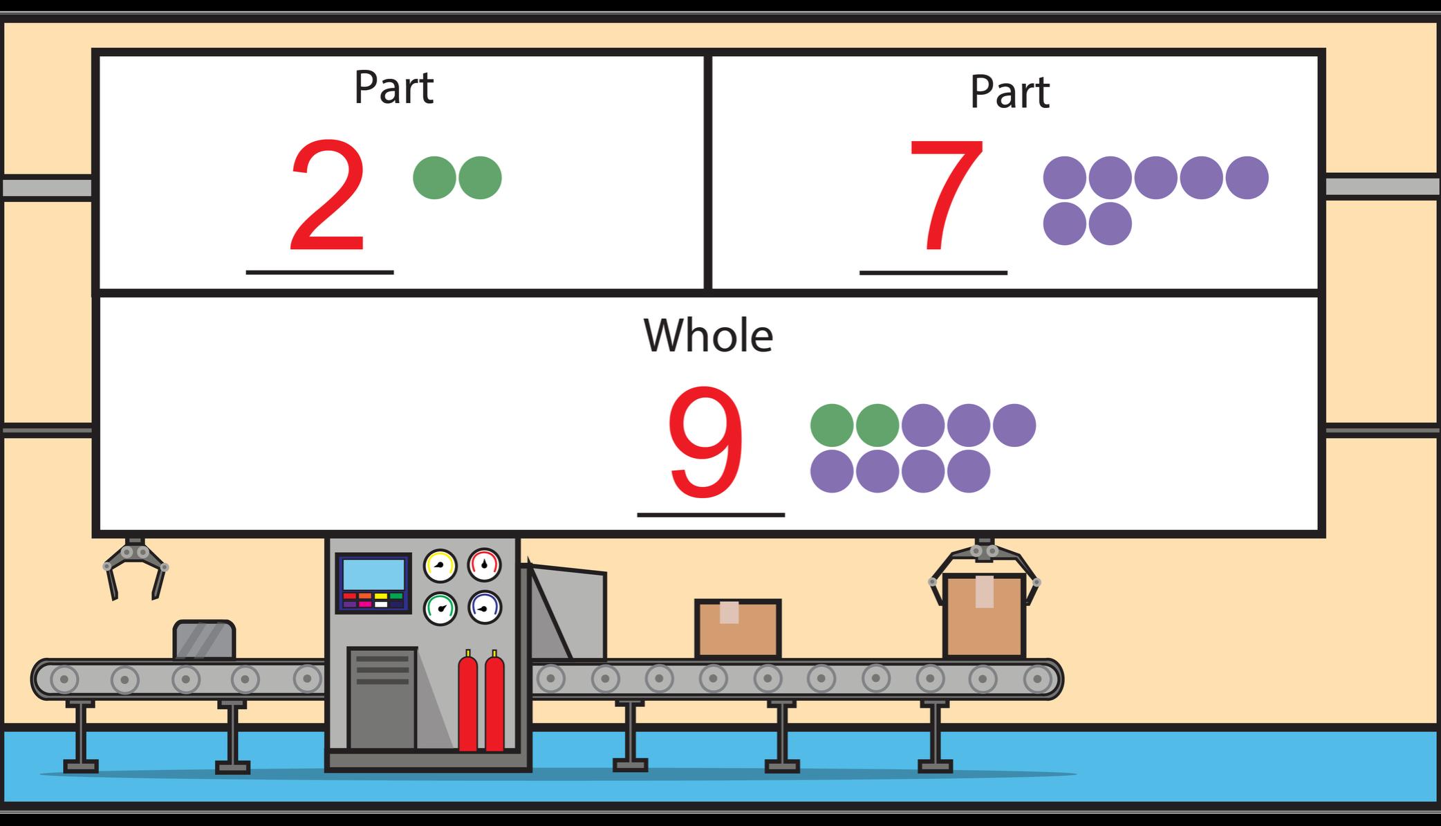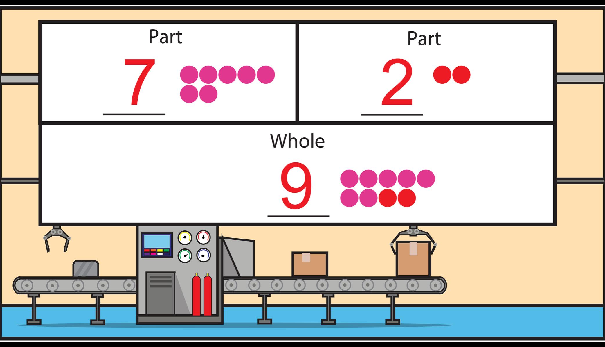 Sophia has a box of crayons with 3 green crayons and some pink ones. There are 9 total crayons in the box. Use the part-part-whole model and complete the number sentence to determine the number of pink crayons in Sophia’s box.
