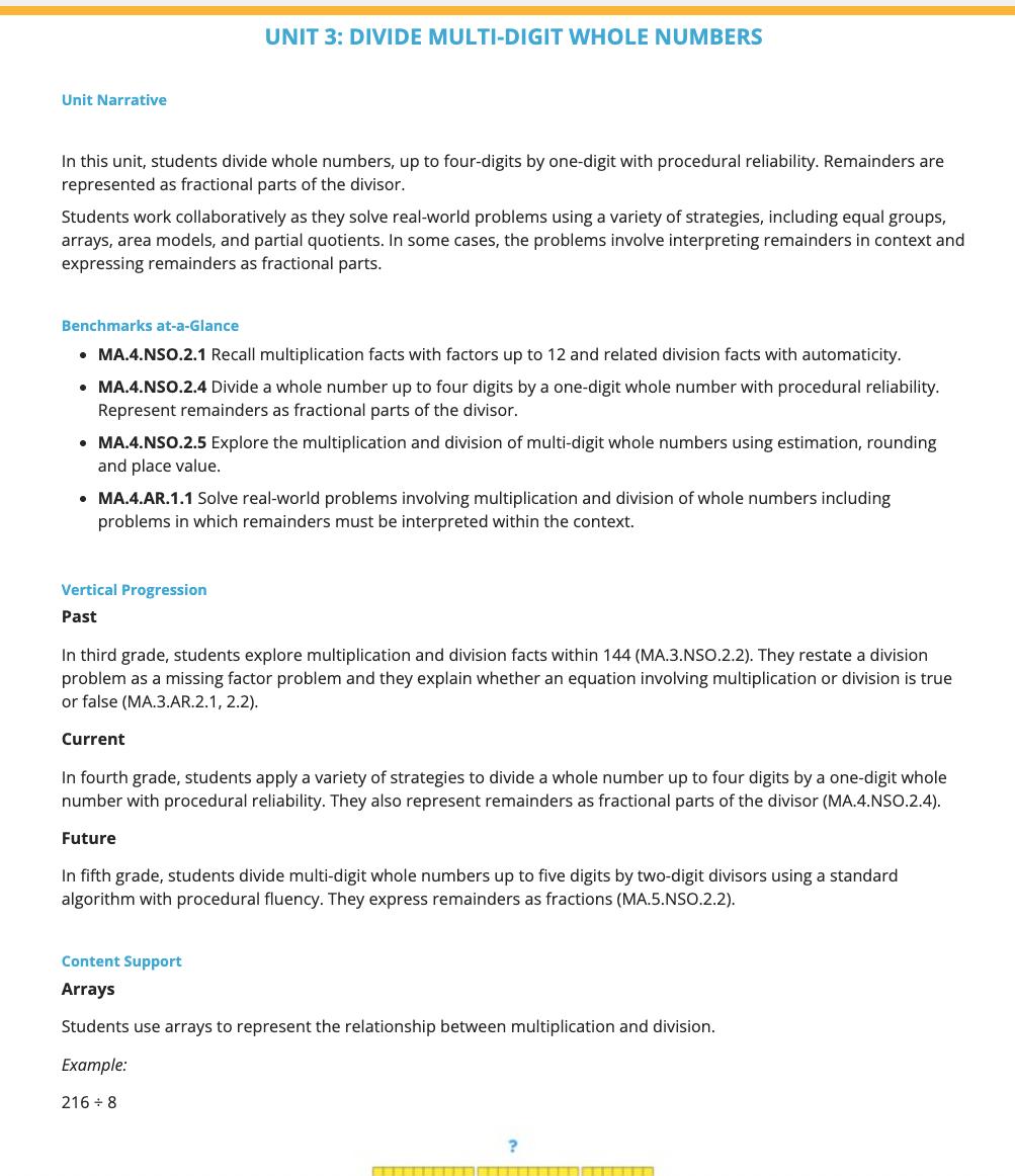 Each unit includes a Unit Overview, or Unit 0, that offers additional planning support for the unit as a whole. Florida’s B.E.S.T. Standards are designed to ensure vertical alignment across grade levels and horizontal alignment within each course. In the Unit Overview, the Unit Narrative section describes the content of the unit, including connections to other units. The Vertical Progression section of the Unit Overview provides the vertical alignment for the benchmarks taught in the unit. Each Unit Overview also incorporates instructional strategies for differentiating, enriching, and implementing lessons throughout the unit.
