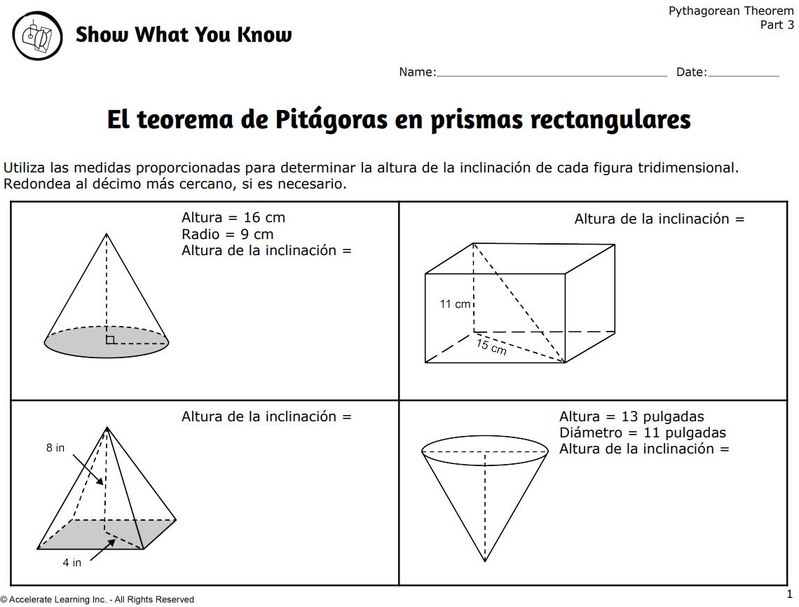 Los estudiantes usan el teorema de Pitágoras para calcular la diagonal de un cuadrado o un prisma rectangular y aplican estos cálculos al analizar problemas geométricos del mundo real relacionados con la forma, el área y el volumen.