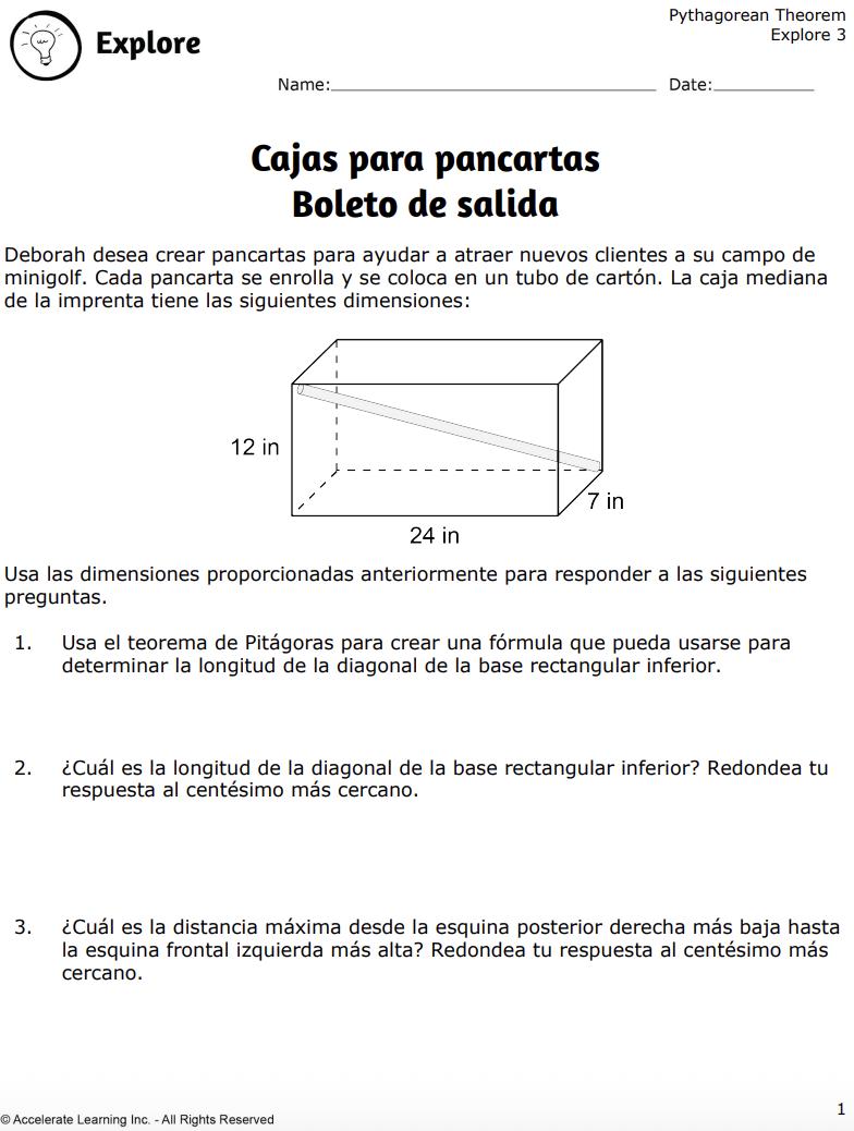Los estudiantes exploran la aplicación del teorema de Pitágoras a prismas rectangulares tridimensionales.