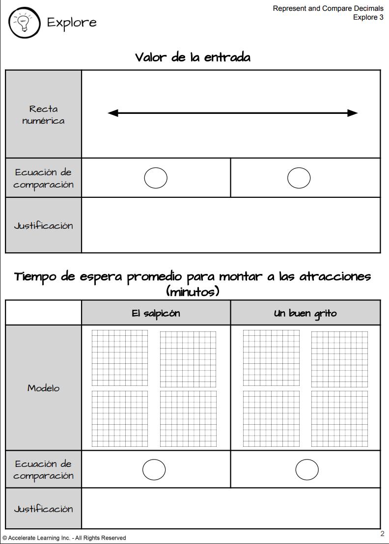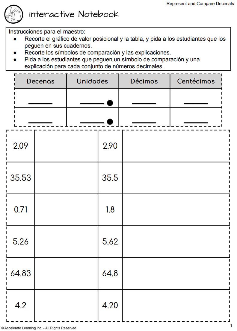 EXPLORACIÓN 3: REPRESENTAR Y COMPARAR DECIMALES Los estudiantes exploran las relaciones de valor posicional para comparar decimales a las centésimas utilizando modelos visuales y símbolos de comparación.
