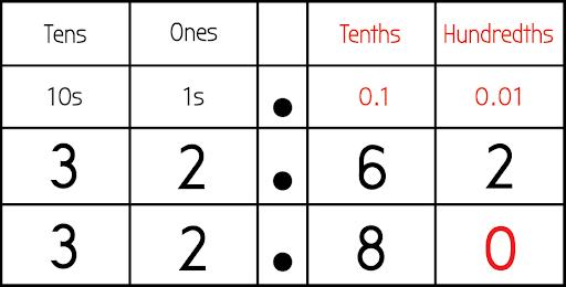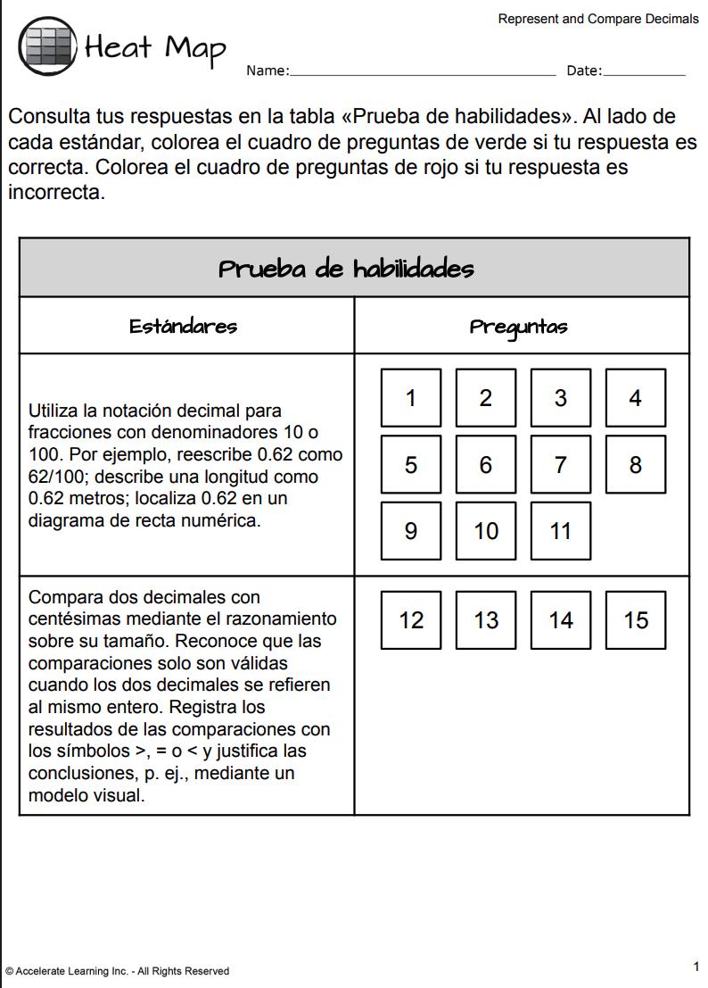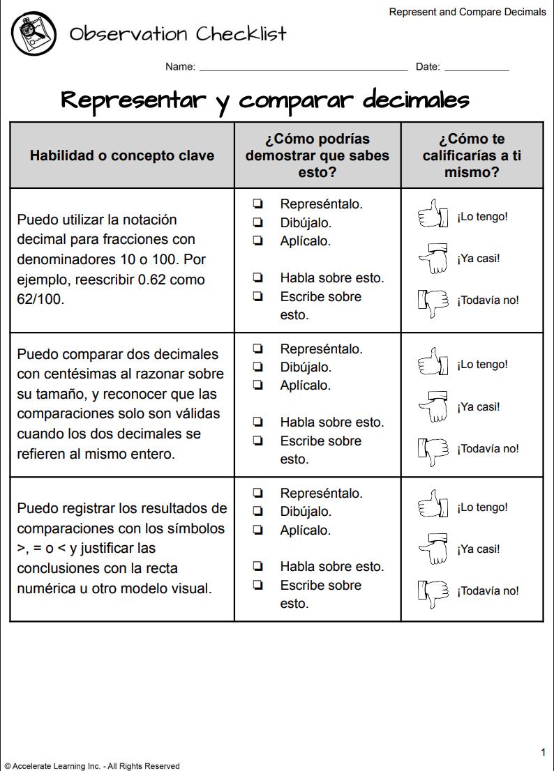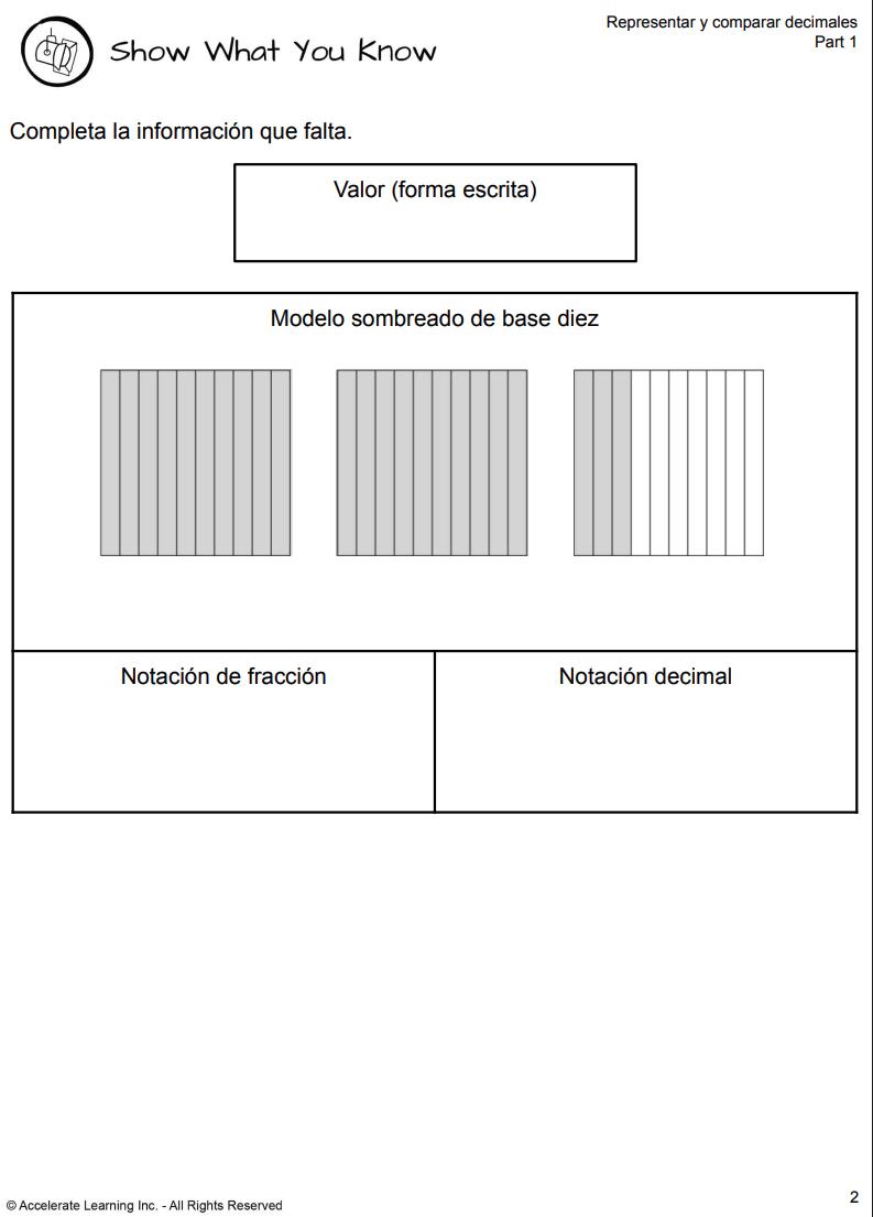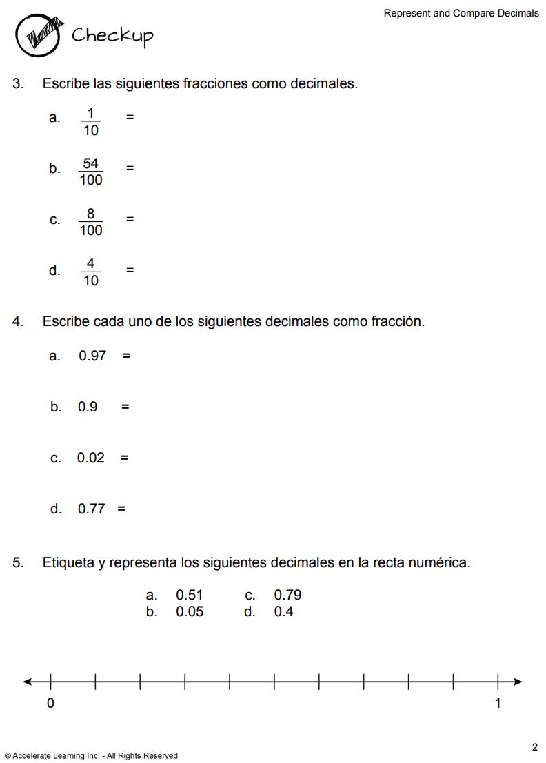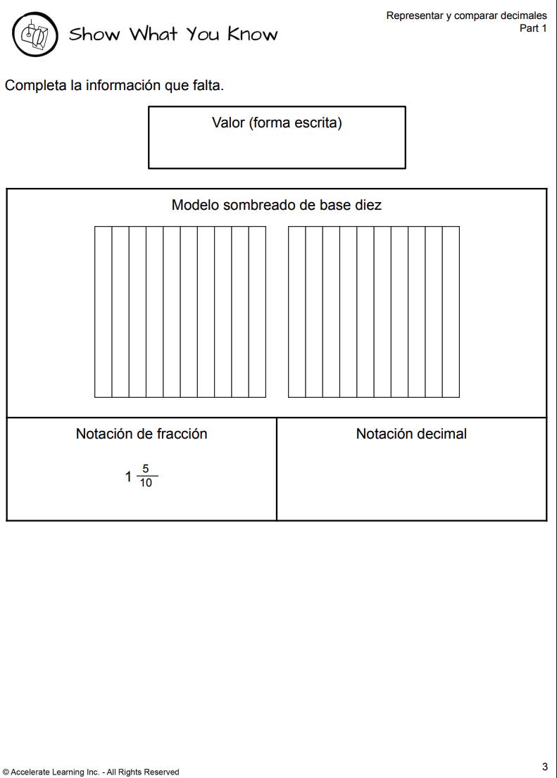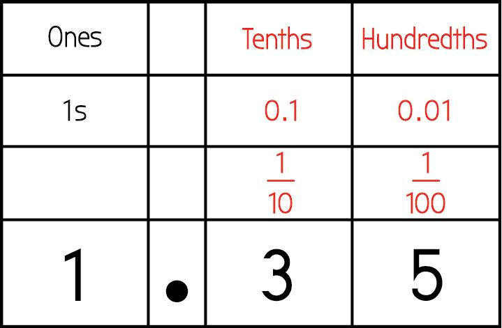 • Puedo leer en voz alta una fracción con un denominador de 10 ó 100, escribirla como decimal y representar cada dígito dentro del decimal en una tabla de valor posicional.