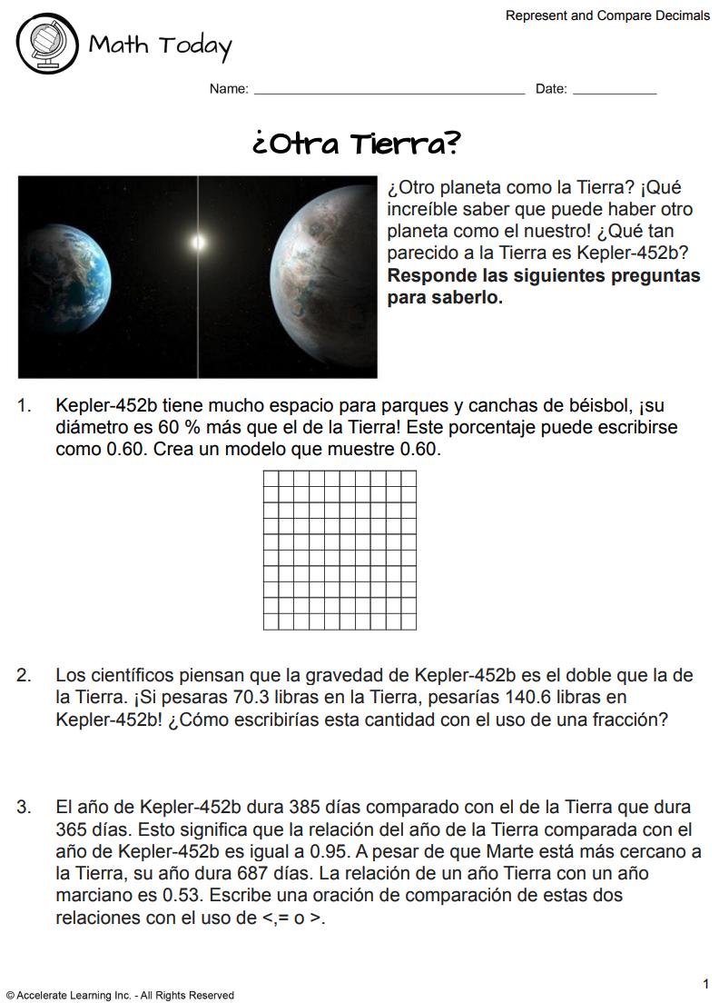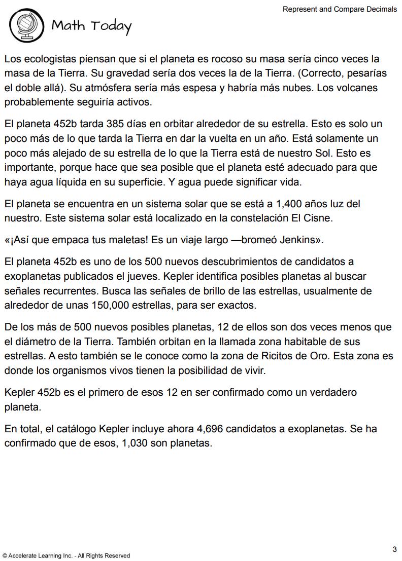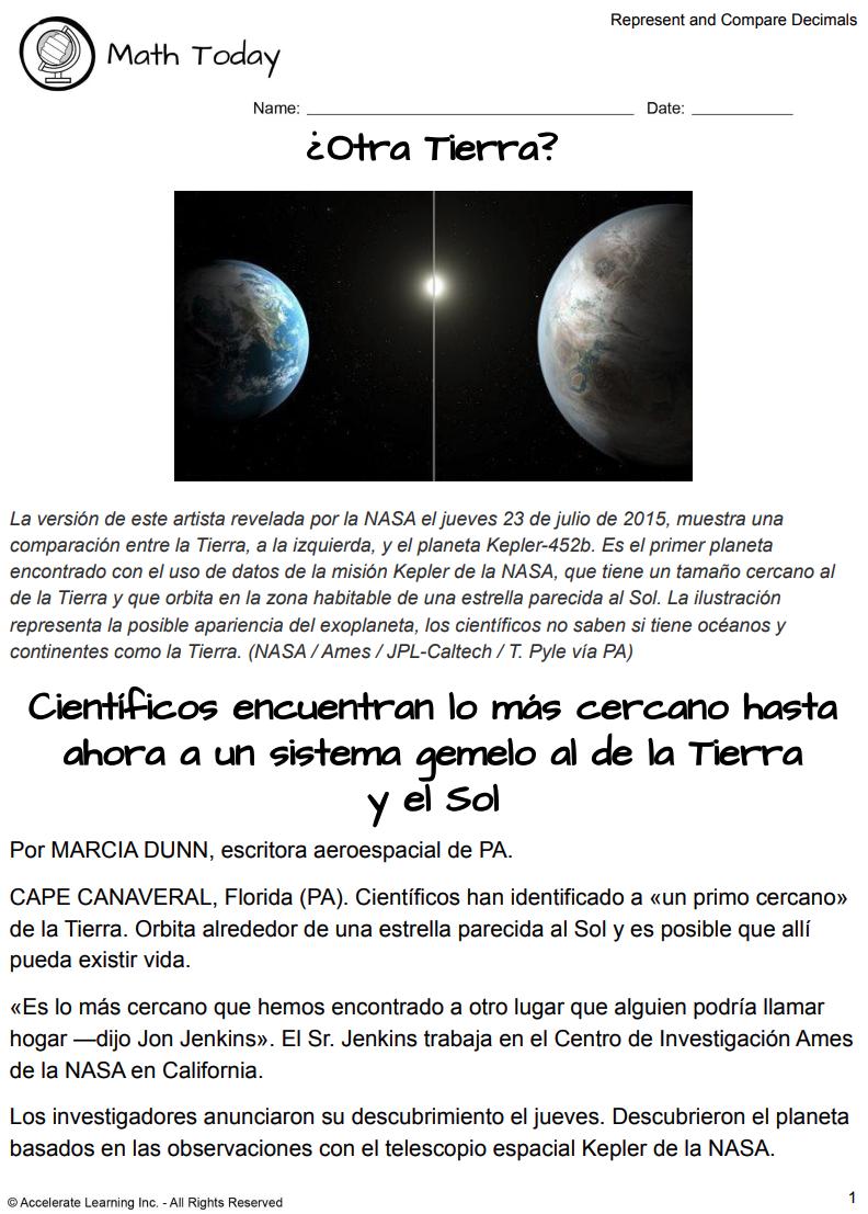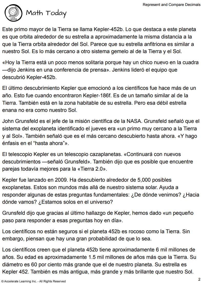 1. Permita que los estudiantes lean el artículo. Explique brevemente que el telescopio espacial Kepler de la NASA se especializa en encontrar planetas y exoplanetas más allá de nuestro propio sistema solar. Este telescopio permite a los científicos conocer mejor el universo que nos rodea. El telescopio espacial Kepler ha descubierto recientemente Kepler-452b, un planeta que es el más cercano que los científicos han encontrado nunca a nuestro planeta Tierra. Similar a la Tierra, Kepler-452b orbita su estrella aproximadamente a la misma distancia a la que nuestra Tierra orbita el Sol.