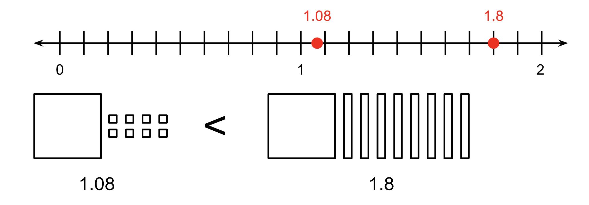 c. ¿Cómo te ayudó la recta numérica a comparar los dos números? Pudimos ver que 1,08 está más cerca de 0 en la recta numérica, y 1.8 está más lejos de 0, por lo que 1.08 es menor que 1.8.