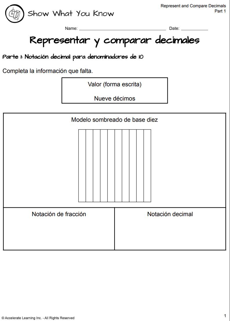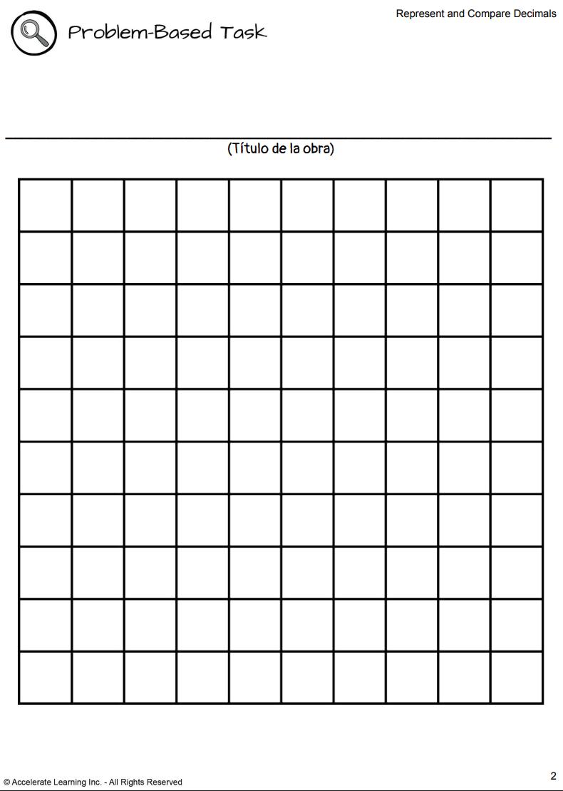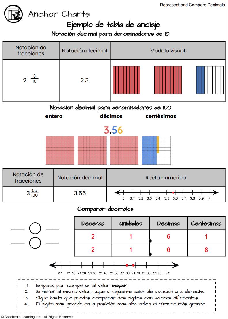 Los estudiantes utilizan rectas numéricas, cuadrículas de base diez y modelos de áreas para representar cantidades decimales y escribirlas como fracciones con denominadores de 10 ó 100.