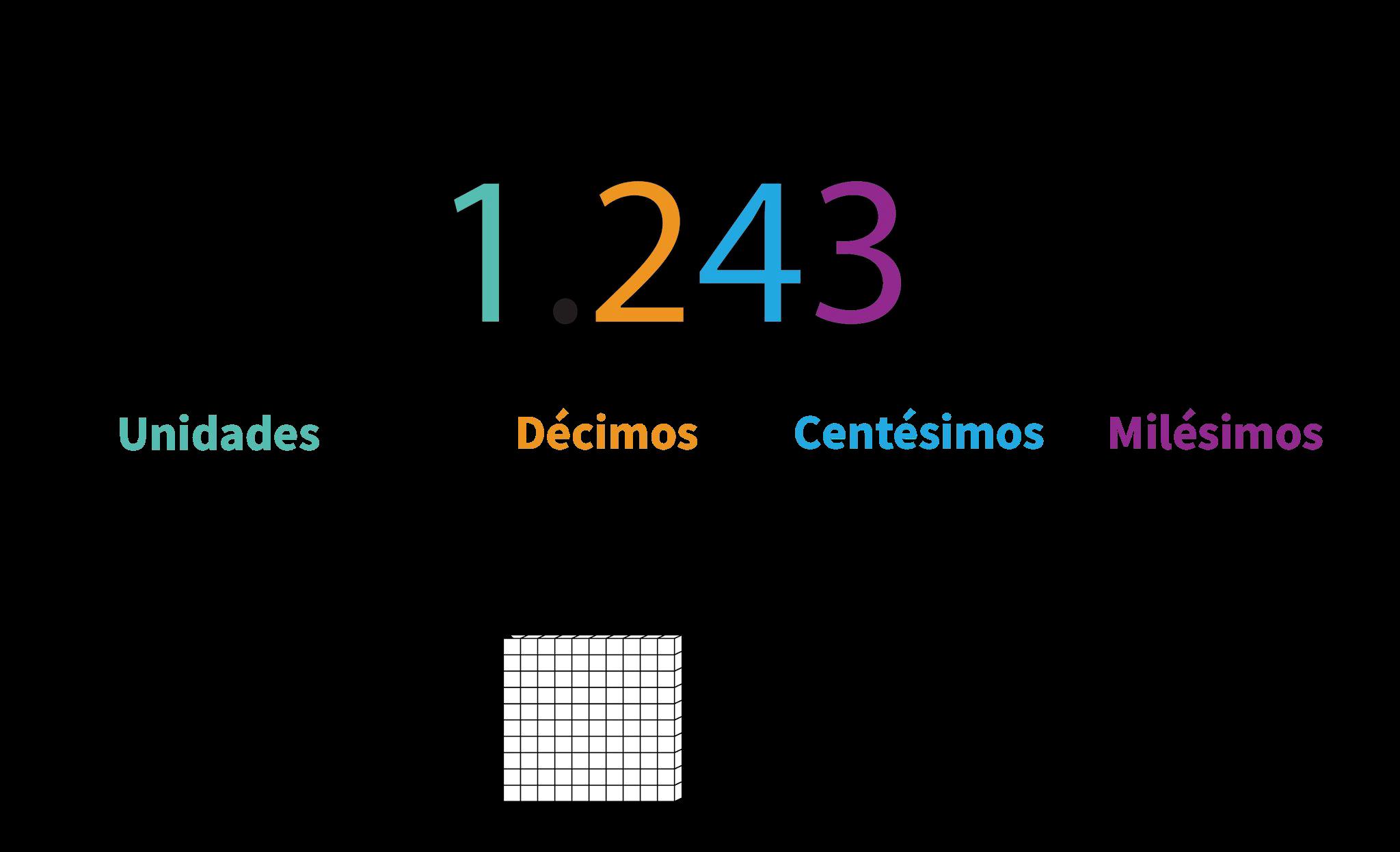 Los estudiantes utilizan modelos de basediez y una tabla de valor posicional para representar fracciones decimales. Escriben en notación decimal fracciones con denominador 10.