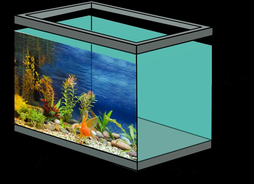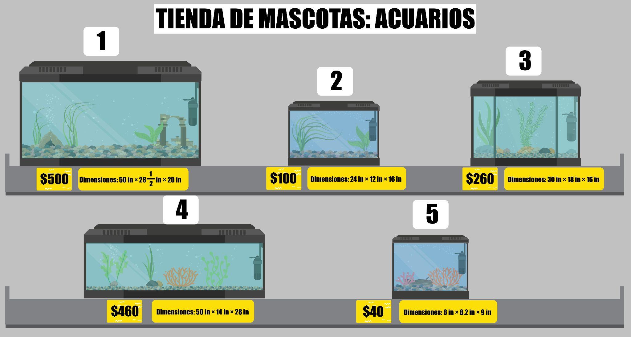 Anaya y su familia están en la tienda de mascotas y buscan peceras para sus goldfish Buscan una pecera que contenga un paisaje con plantas y que sea lo suficientemente grande para que incluya más peces que se añadirán en el futuro. Han reducido sus opciones a la pecera azul y a la pecera gris que se muestran a continuación. ¿Preferirías comprar la pecera azul o la pecera gris? Justifica tu razonamiento con matemáticas.