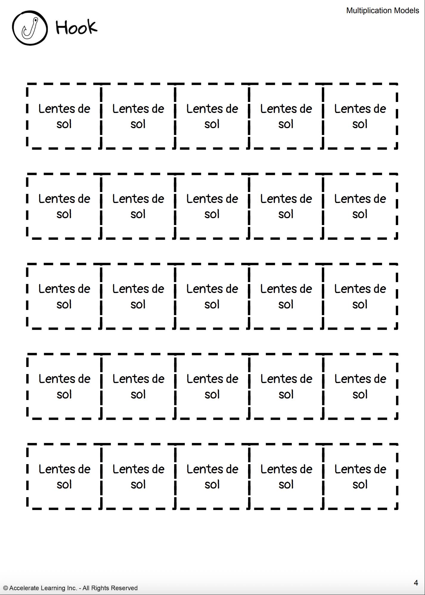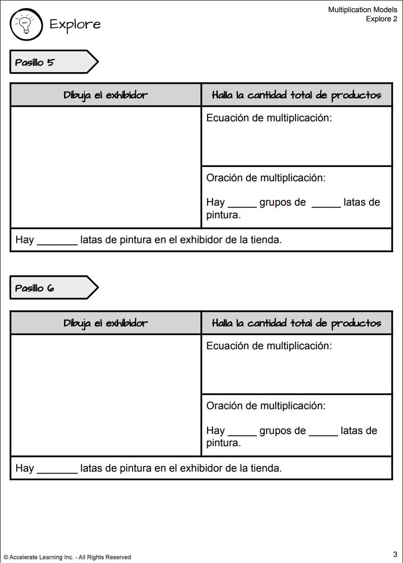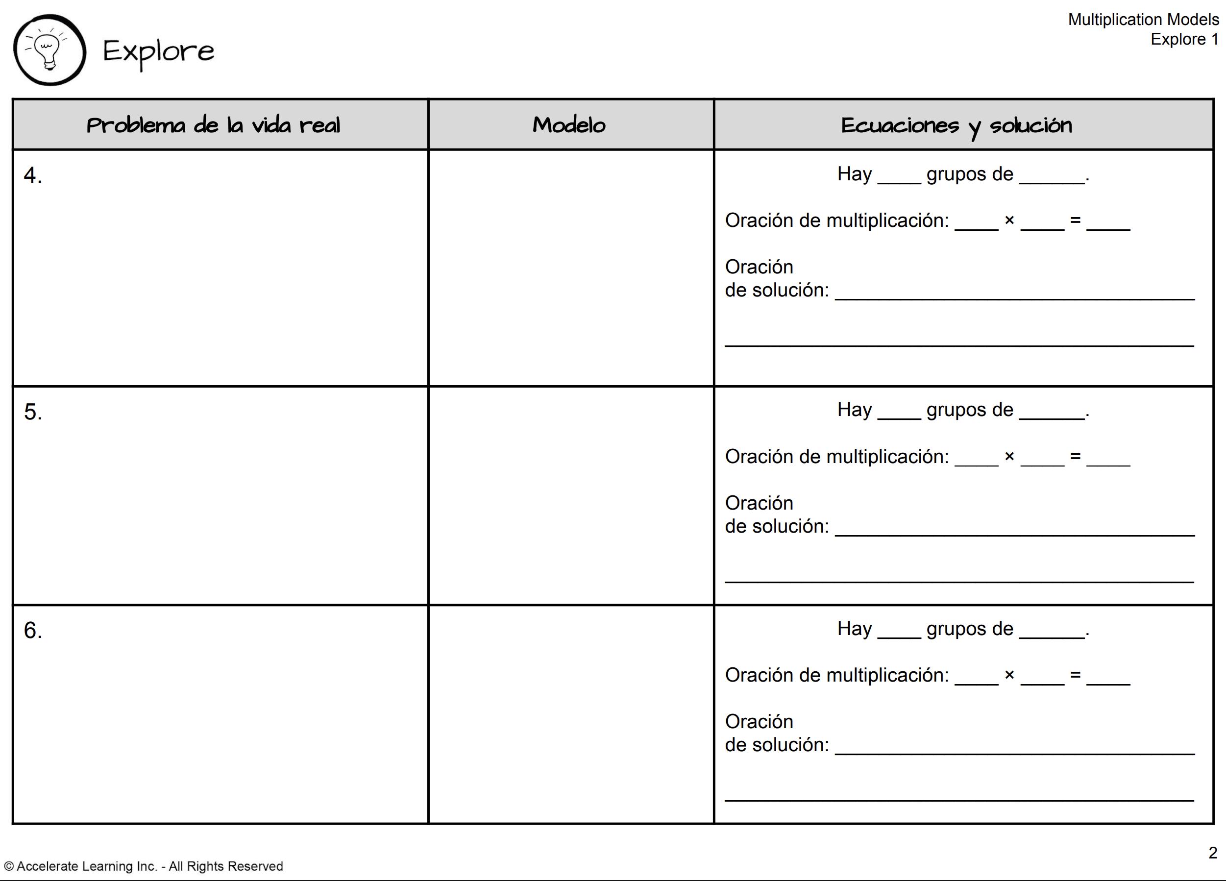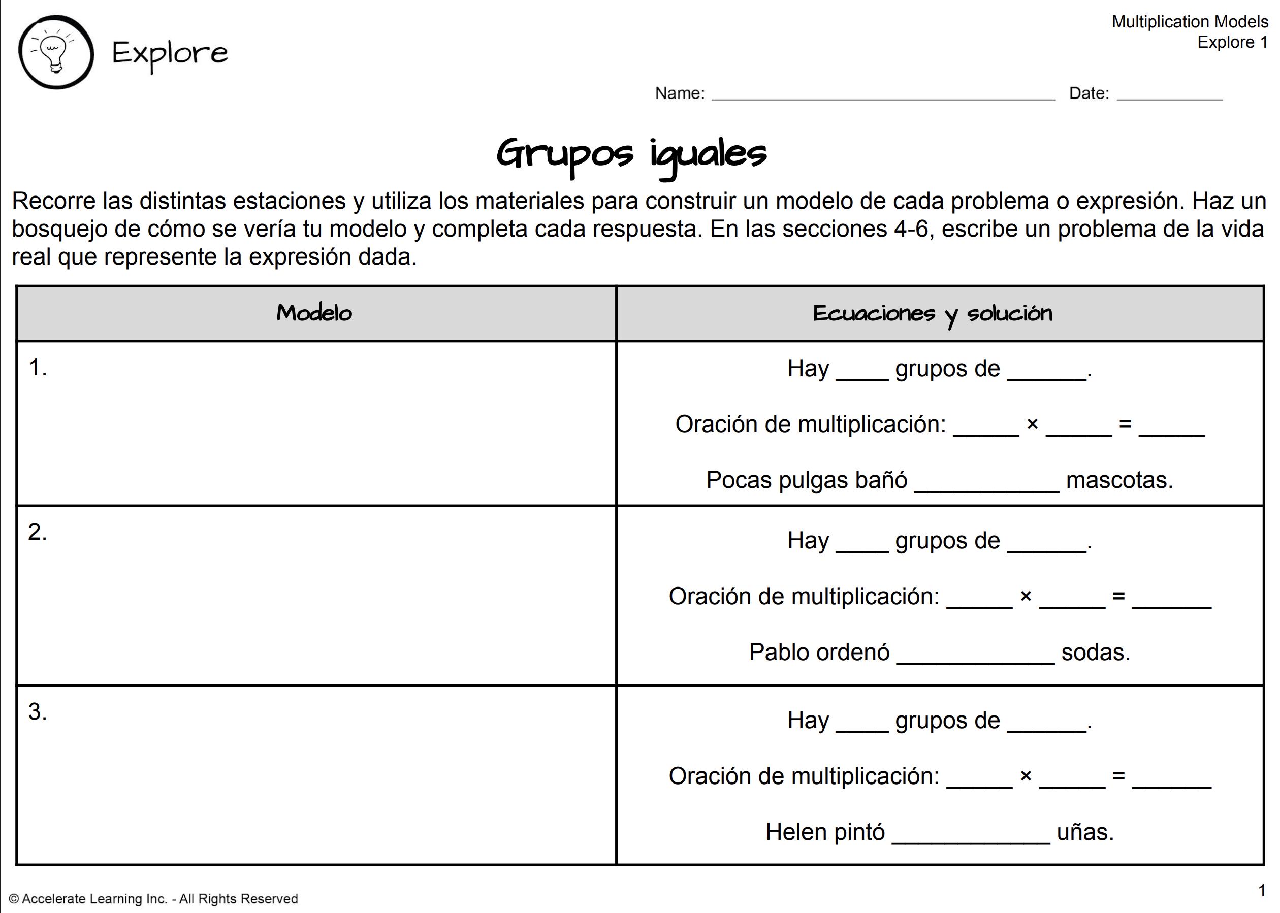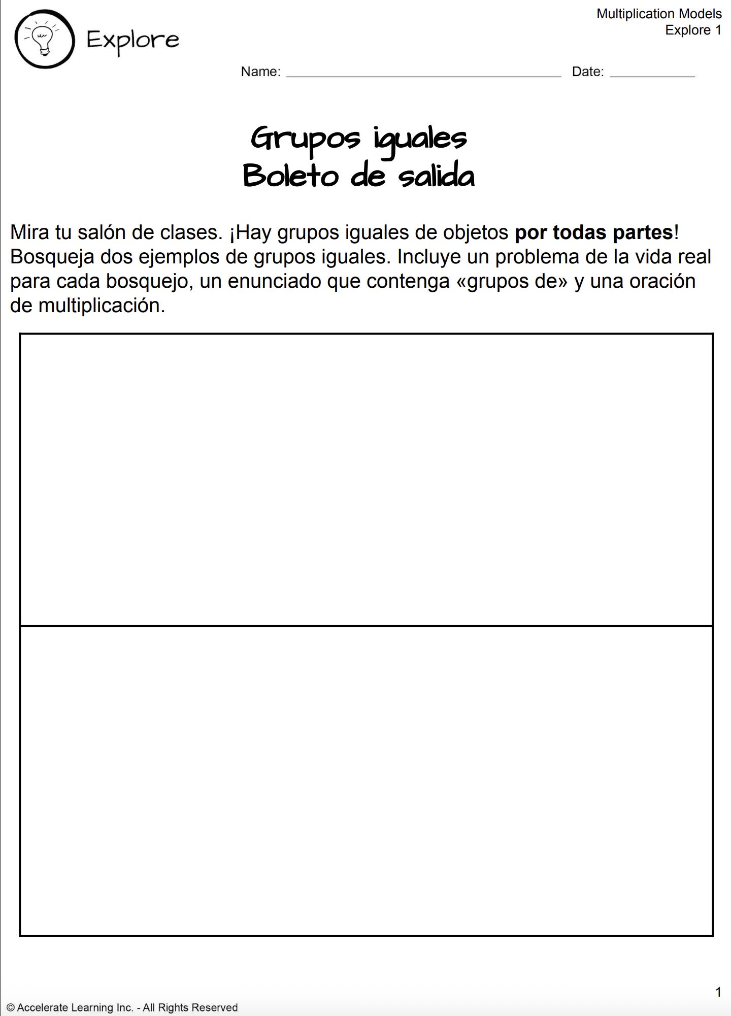 Se presenta a los estudiantes una actividad en la que determinan una cantidad total en grupos iguales utilizando modelos de multiplicación. Volverán a realizar la actividad después de haber completado las exploraciones correspondientes.