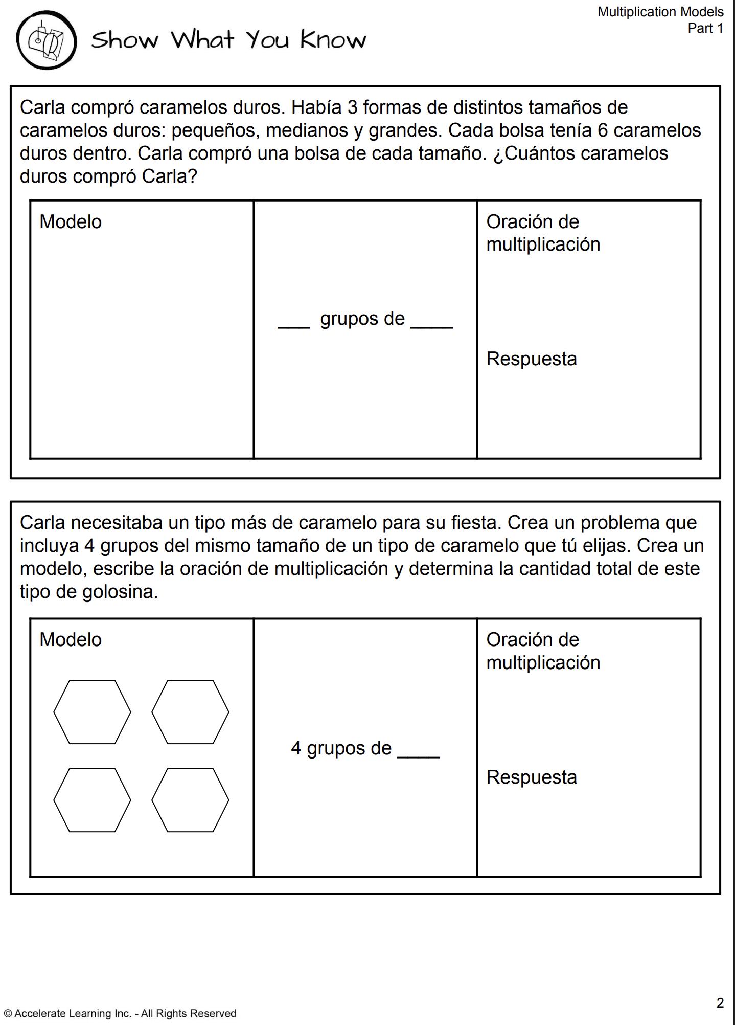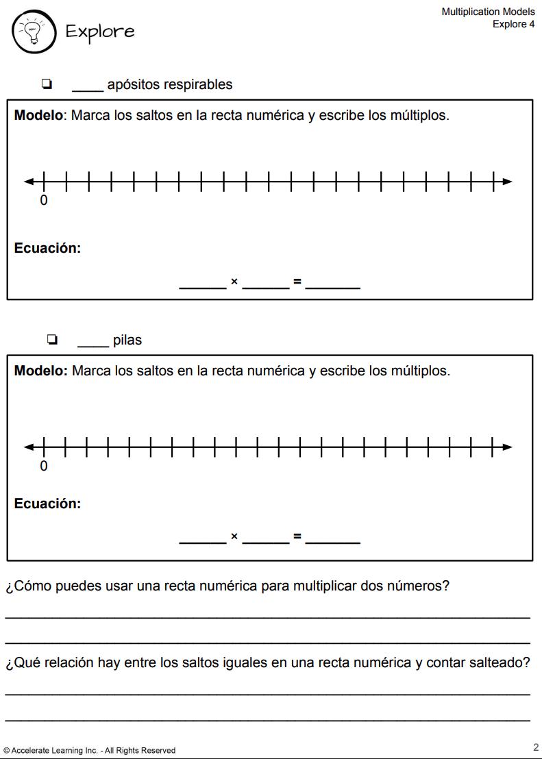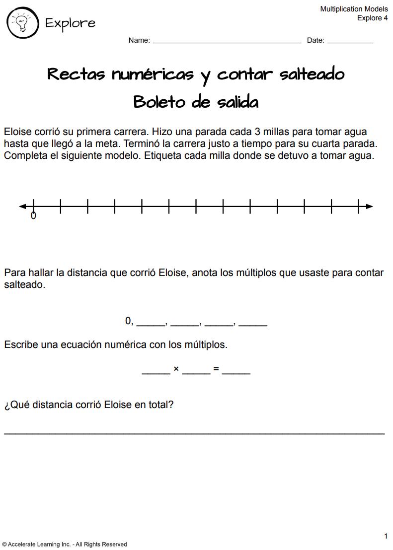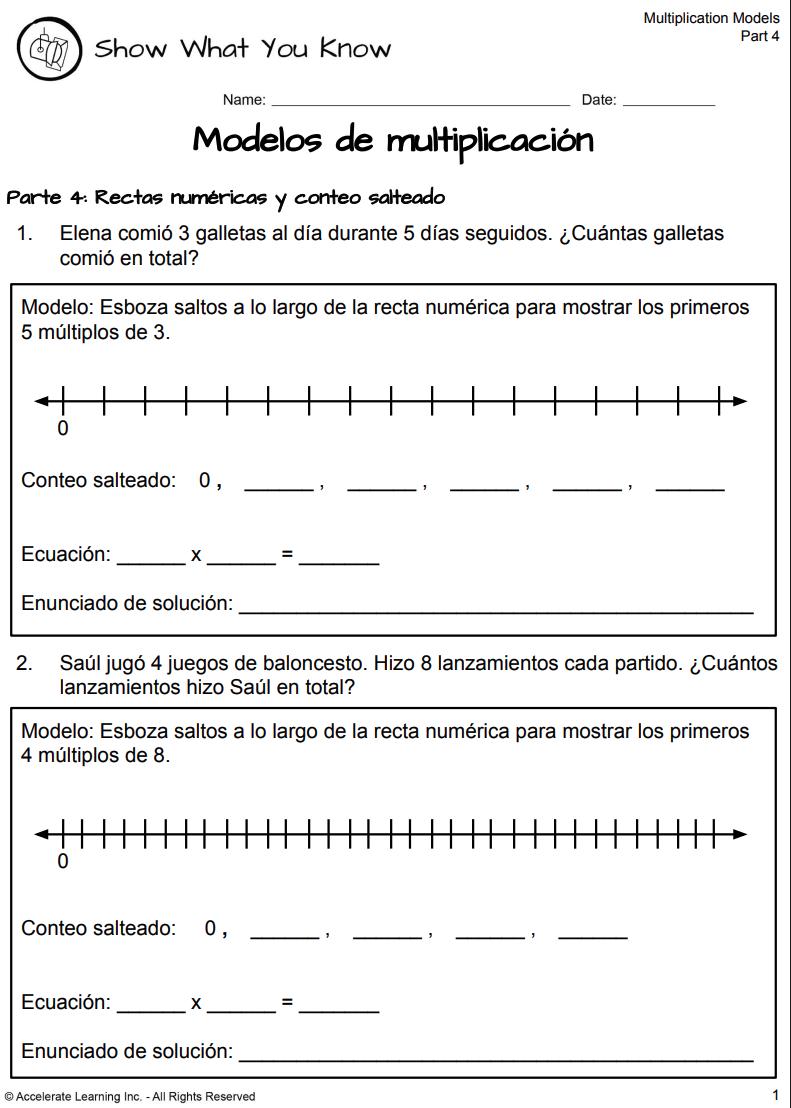 1. Pida a los estudiantes que platiquen sobre lo que recuerdan del uso de rectas numéricas para ayudar a resolver problemas de multiplicación. Permita que compartan sus conocimientos y comprensión con el grupo.