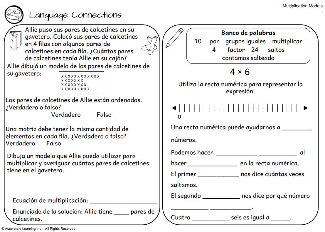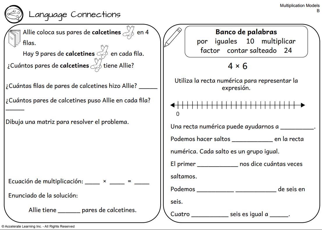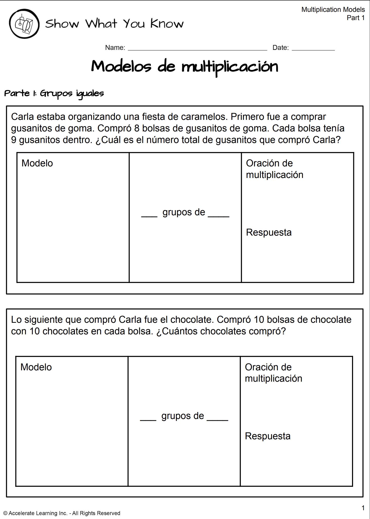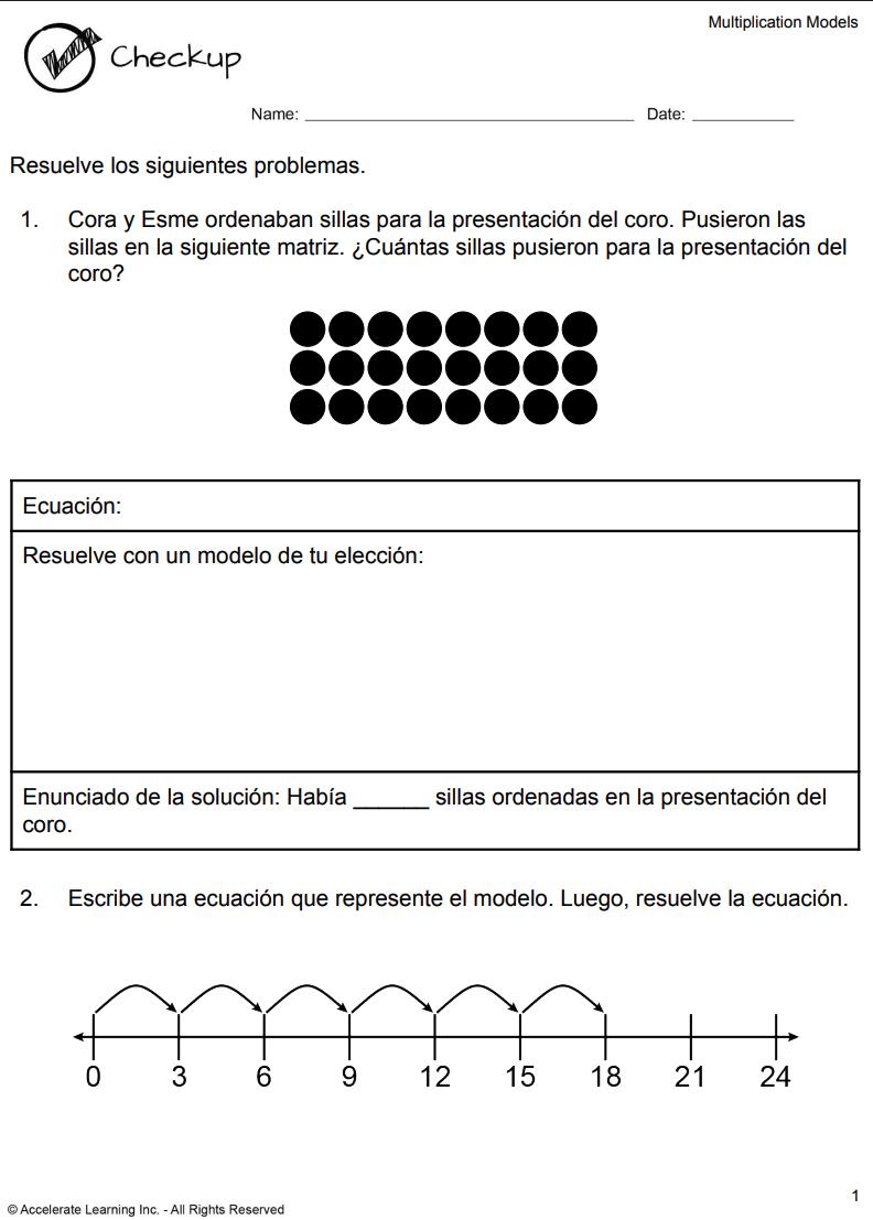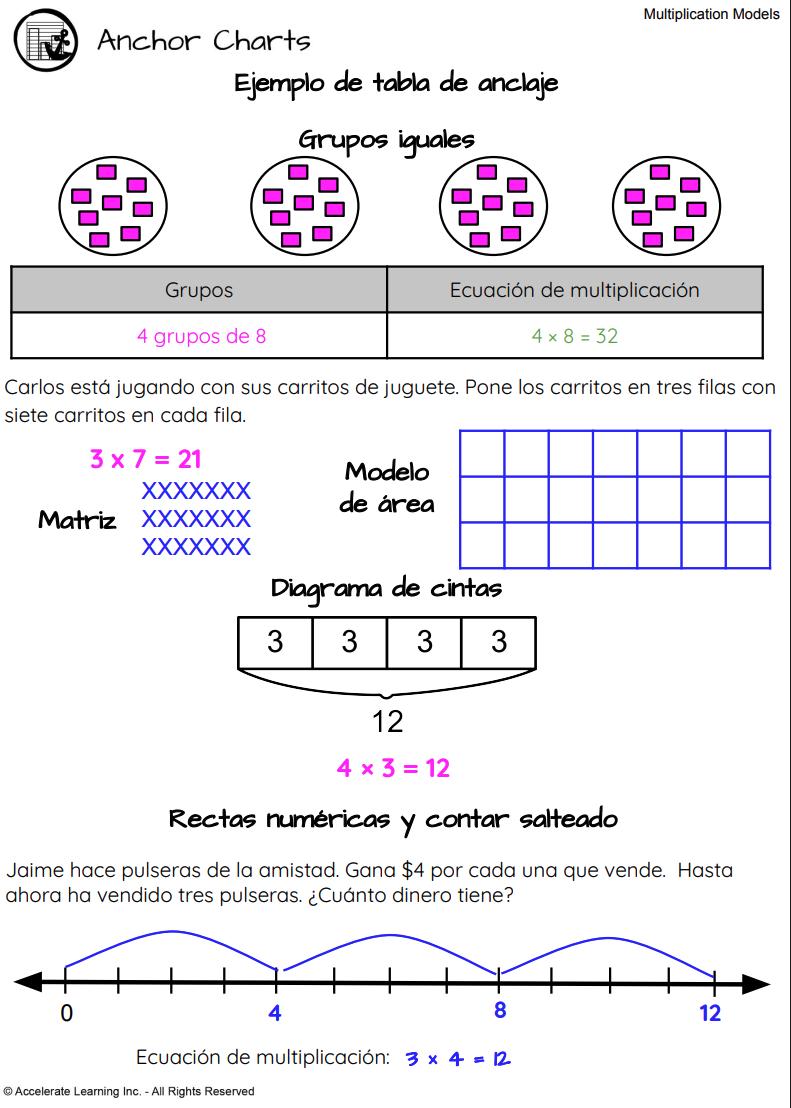 1. Pida a los estudiantes que platiquen sobre lo que recuerdan del uso de rectas numéricas para ayudar a resolver problemas de multiplicación. Permita que compartan sus conocimientos y comprensión con el grupo.