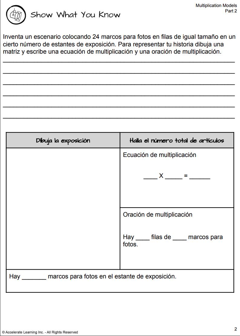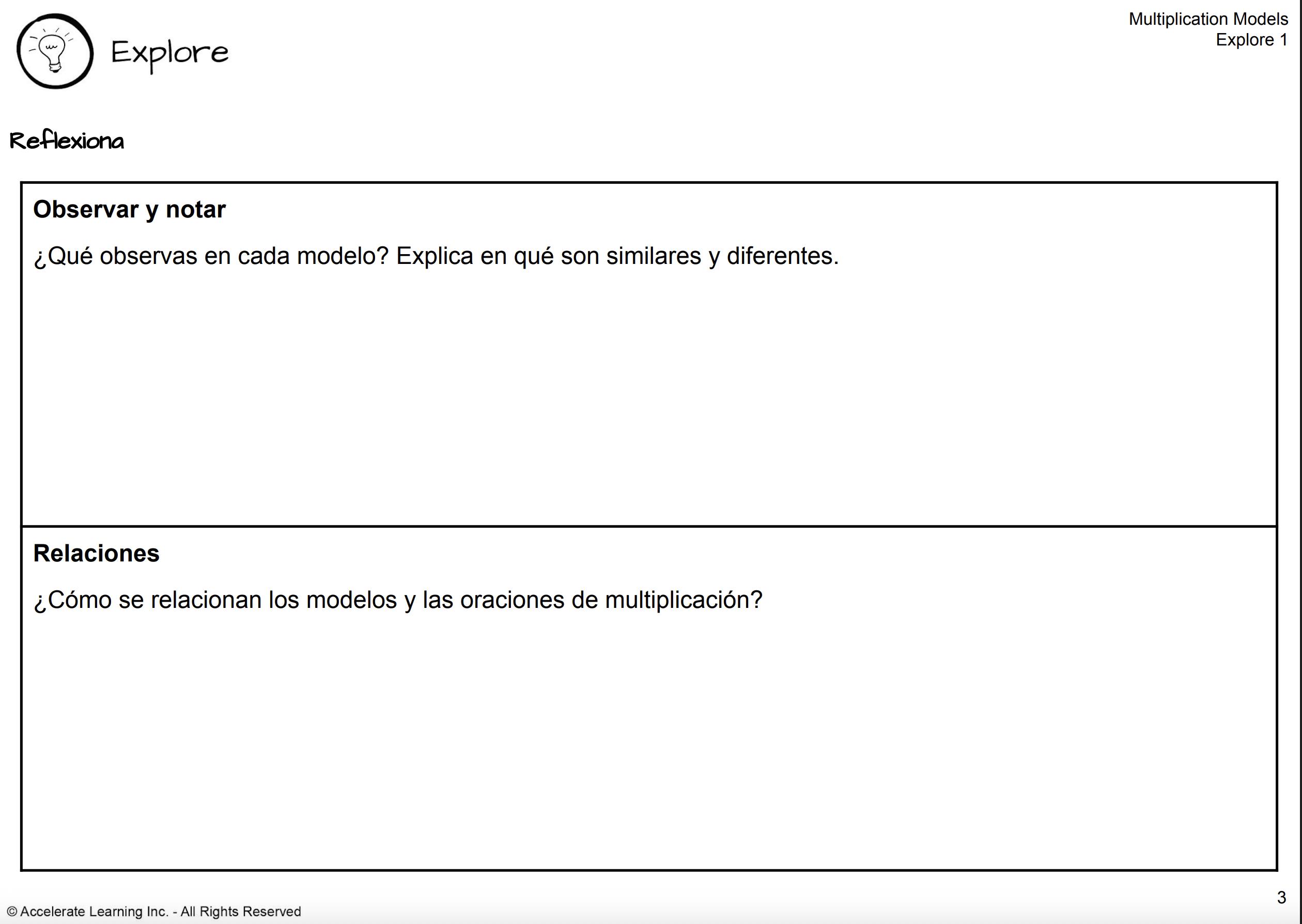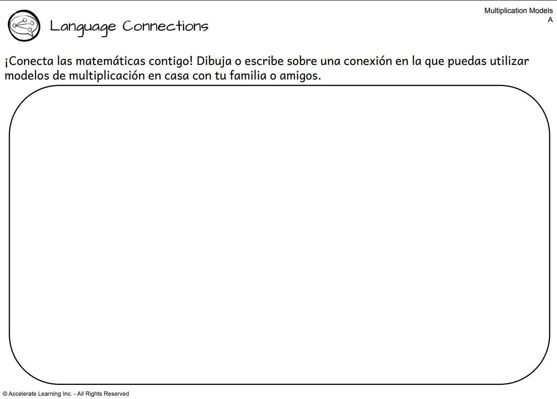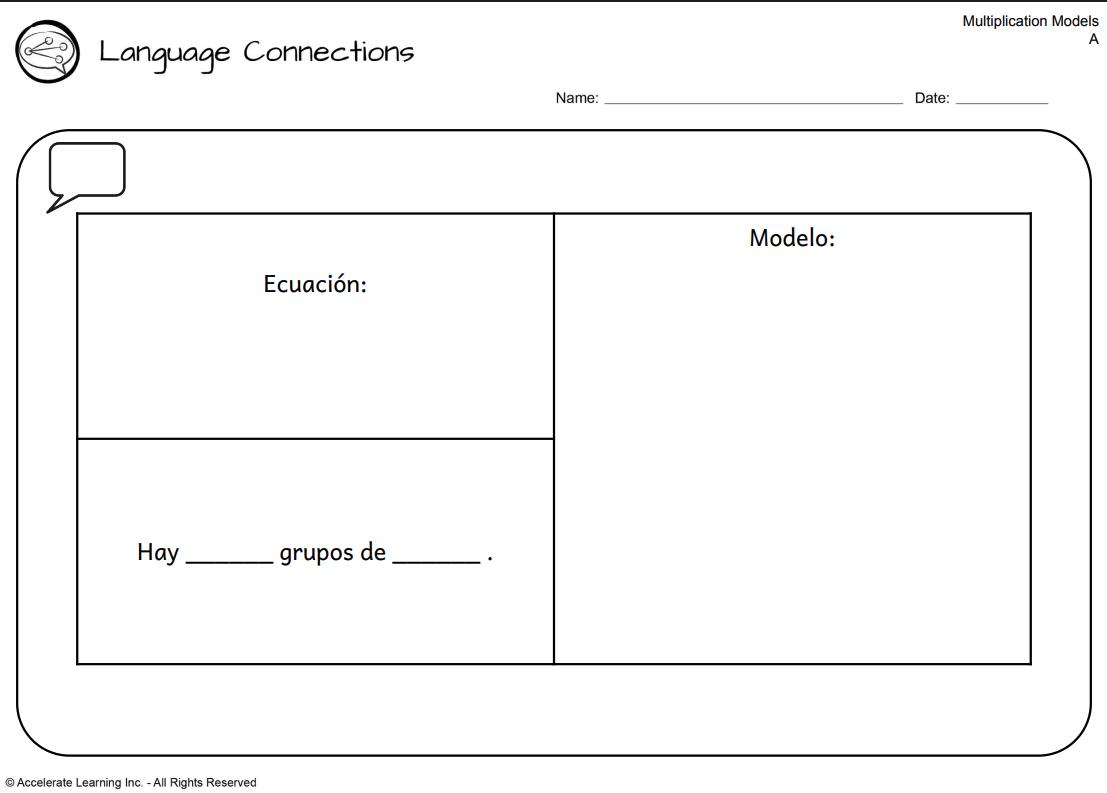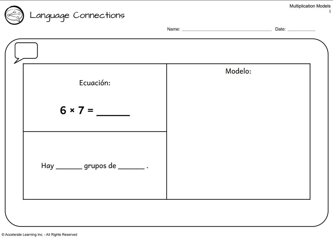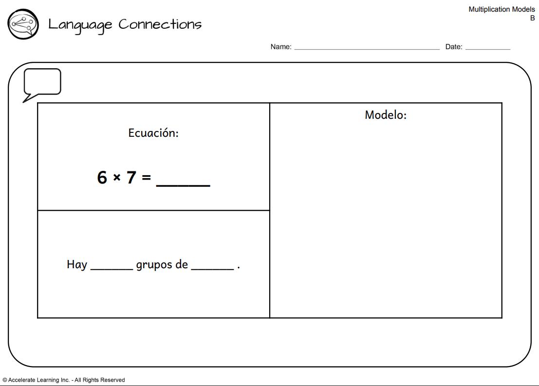 • Cada grupo registra sus hallazgos dibujando modelos de matrices y escribiendo las ecuaciones de multiplicación correspondientes en sus diarios del estudiante.