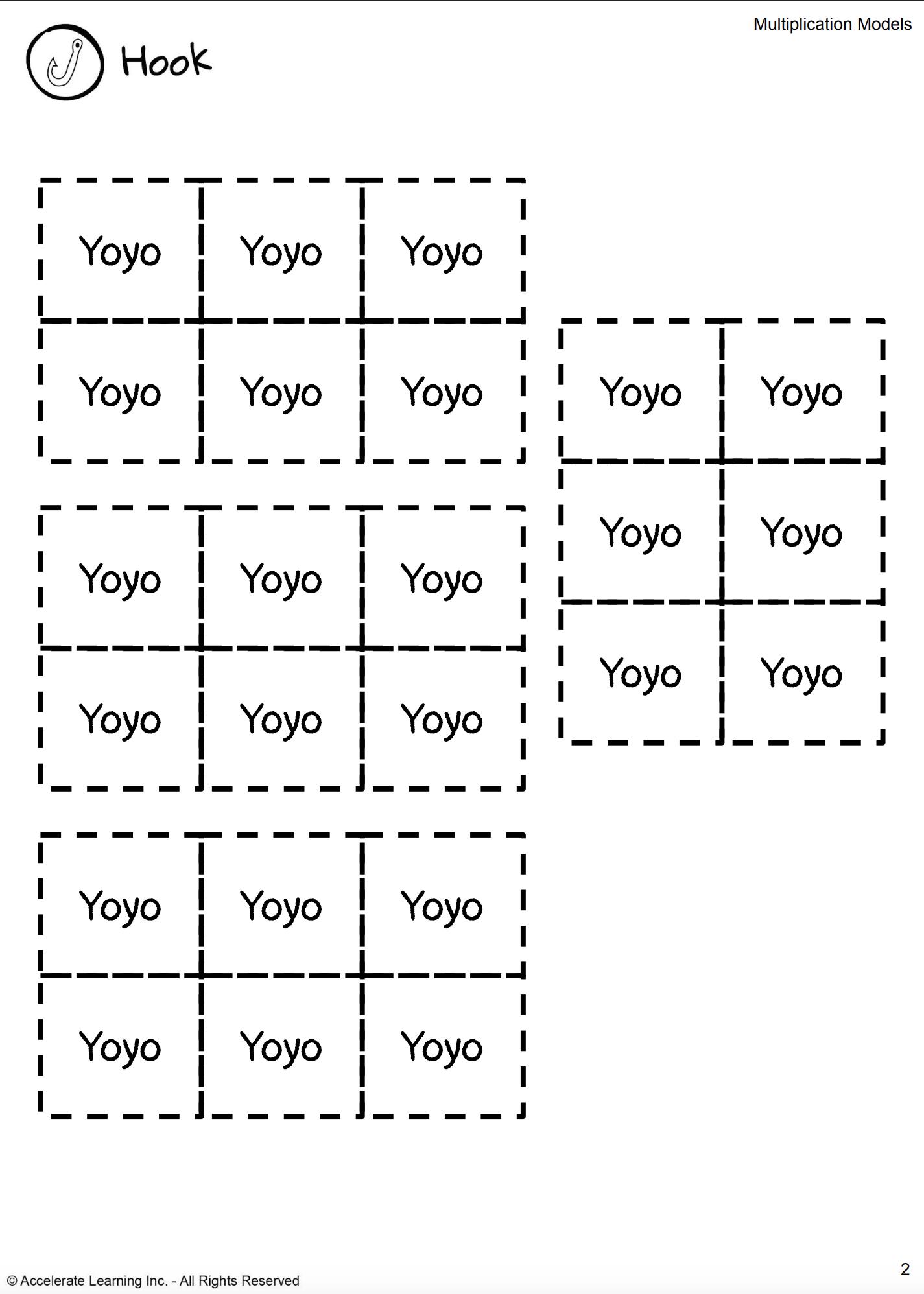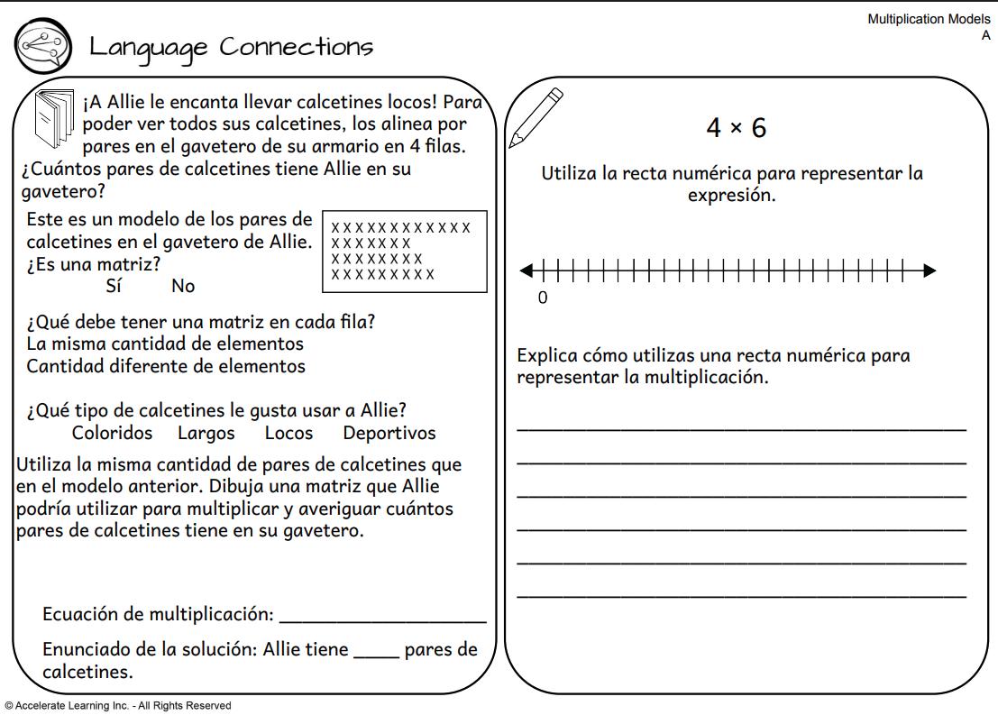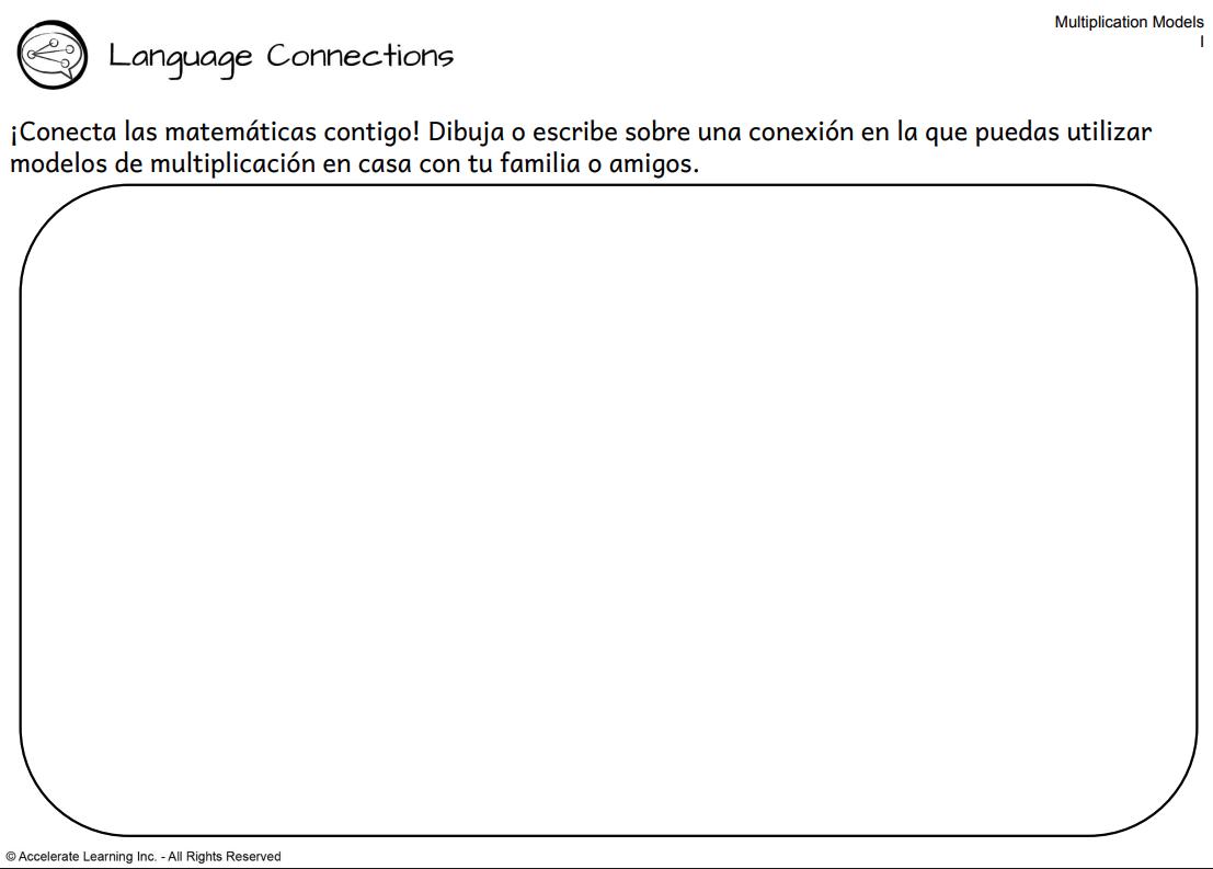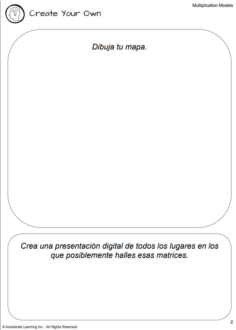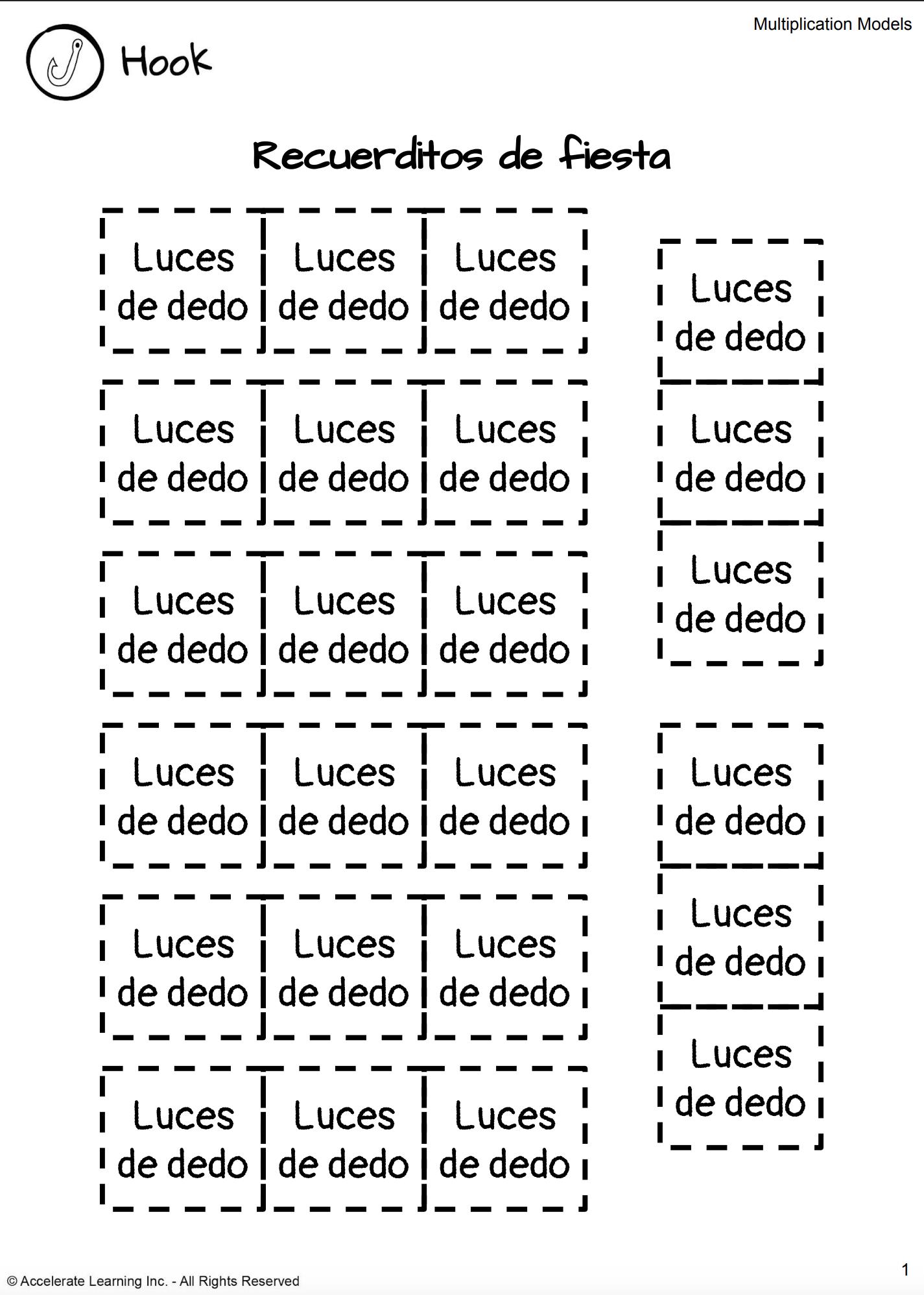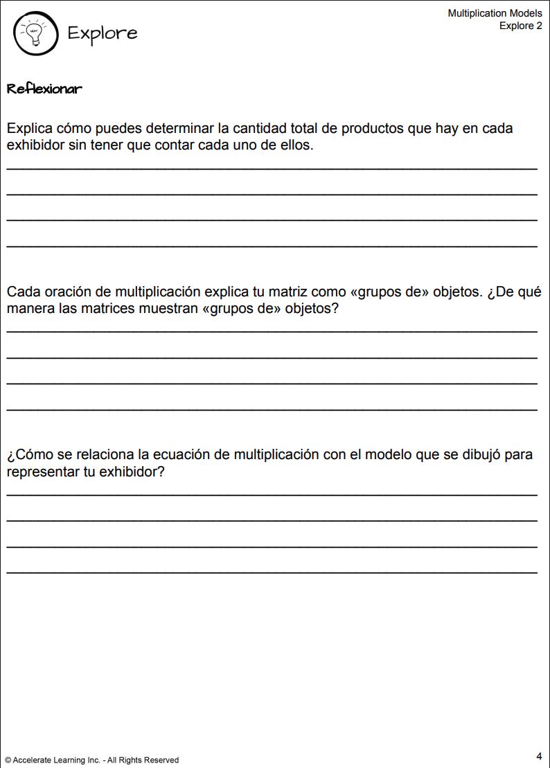 • Cada grupo registra sus hallazgos dibujando modelos de matrices y escribiendo las ecuaciones de multiplicación correspondientes en sus diarios del estudiante.