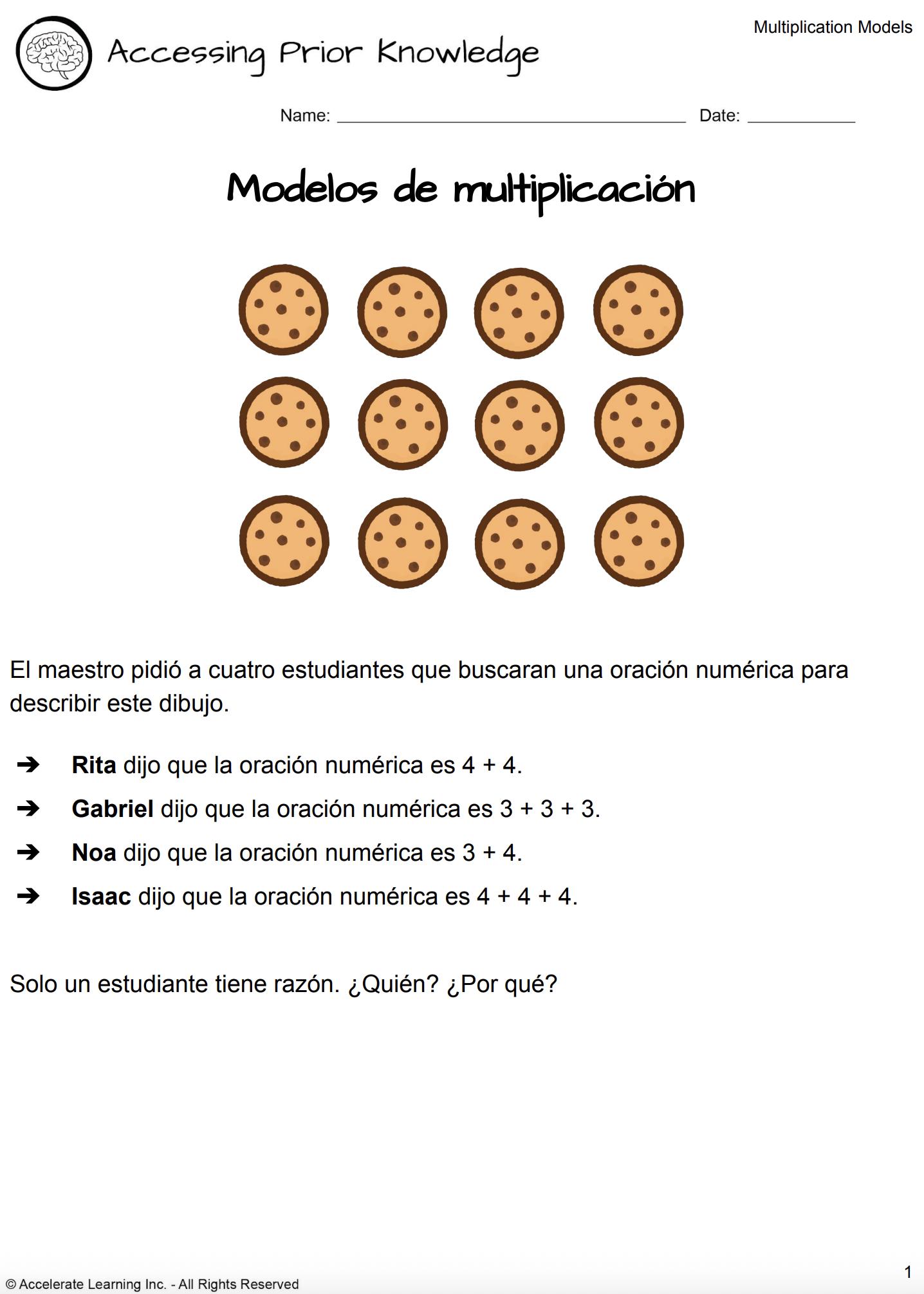 • A través de la conversación, los estudiantes evaluarán diferentes oraciones de multiplicación y justificarán su razonamiento.
