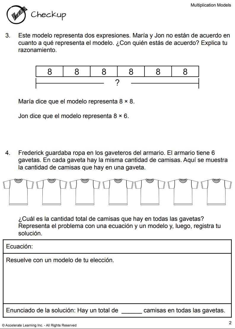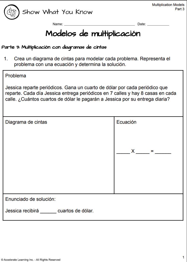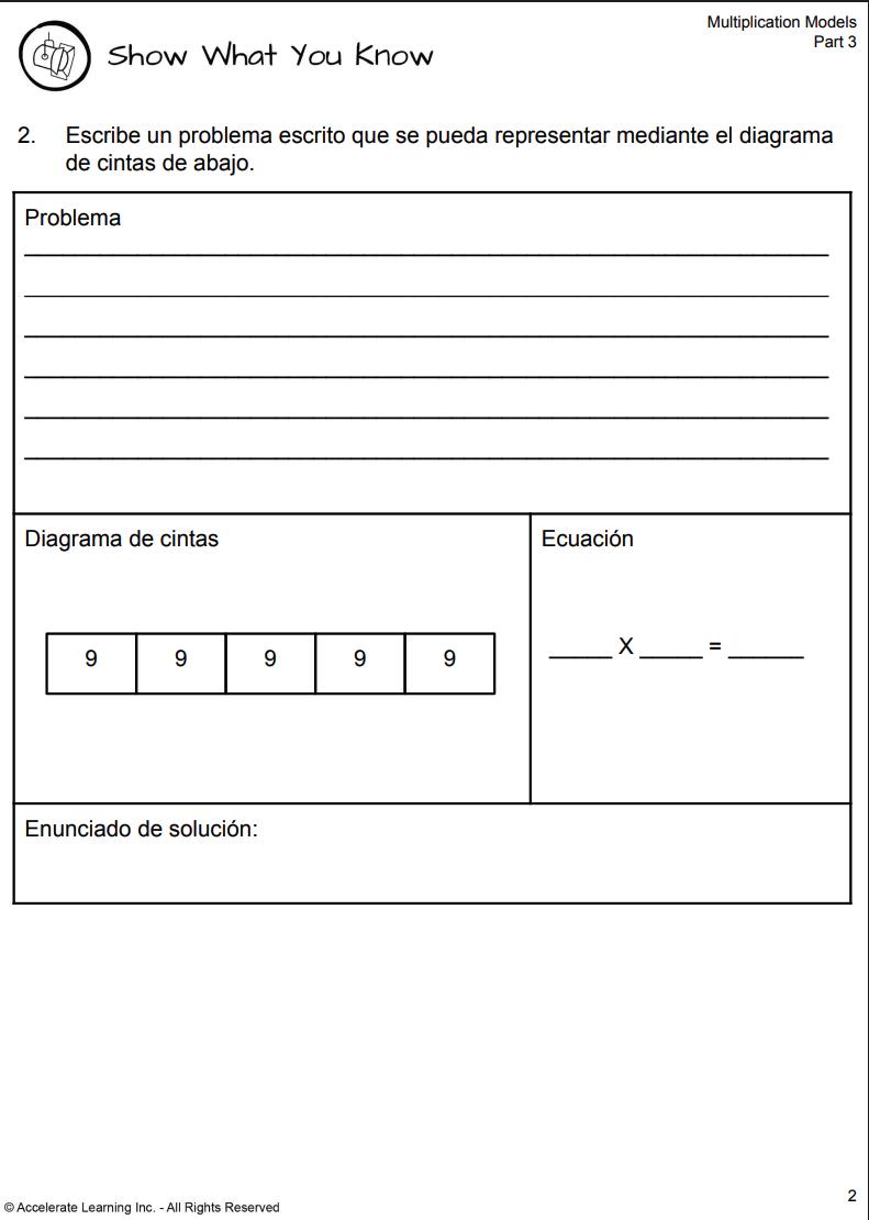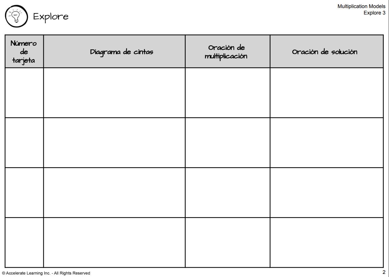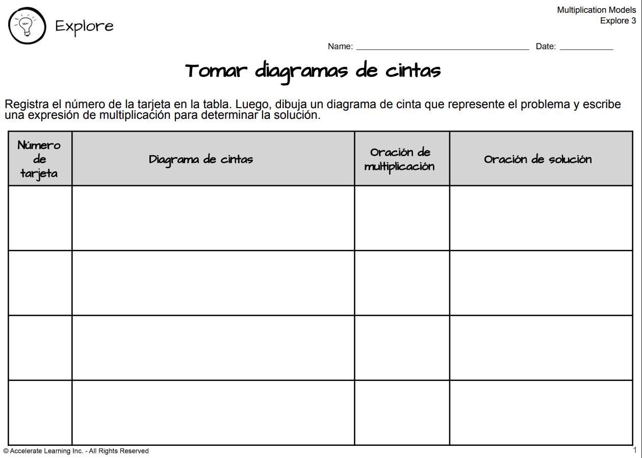 • Crean y analizan diagramas de cinta para representar problemas de multiplicación, registrando sus hallazgos en los diarios del estudiante.