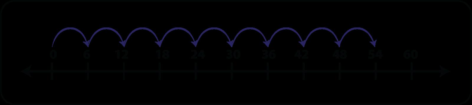 c. «¿Cómo puedes utilizar la recta numérica para hallar el producto del número de peces de todos los acuarios?». Después de contar 9 veces en grupos de 6, encontramos que el producto es el número final en el que caemos y rodeamos.