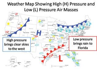 low-pressure air mass – an air mass with less atmospheric pressure than the surrounding air masses; air moves toward the low pressure, traveling in a counterclockwise direction in the northern hemisphere and a clockwise direction in the southern hemisphere