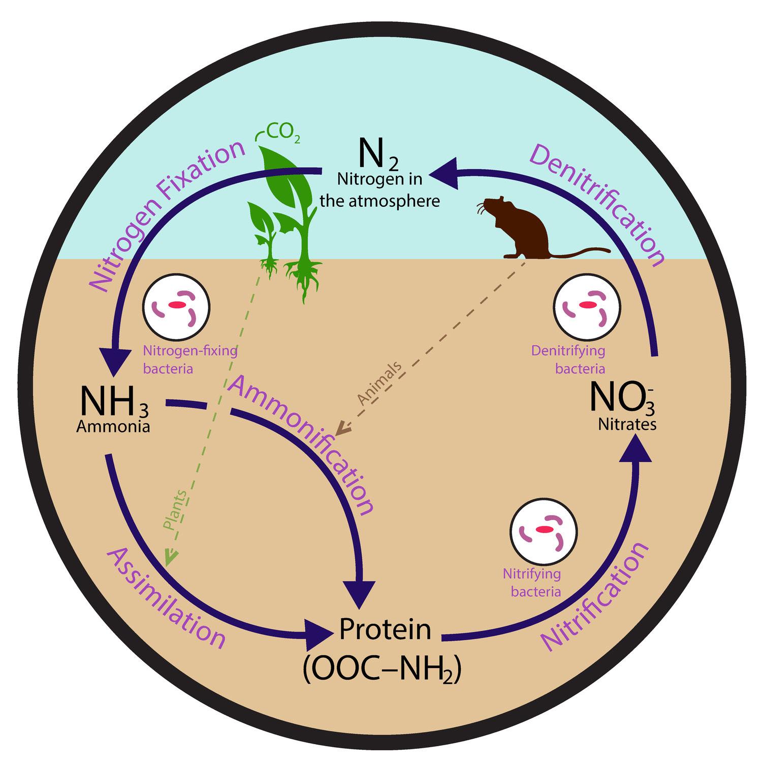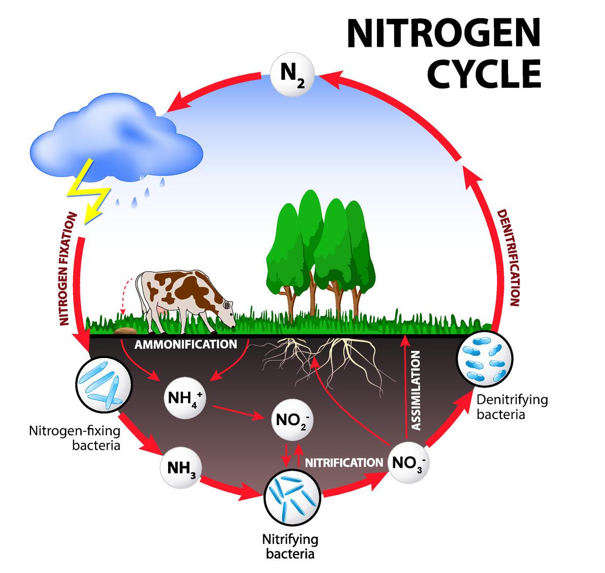 nitrogen cycle – the process by which nitrogen is converted among various chemical forms as it cycles among the soil, biosphere, lithosphere, and atmosphere