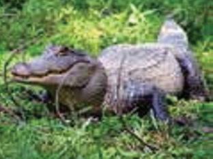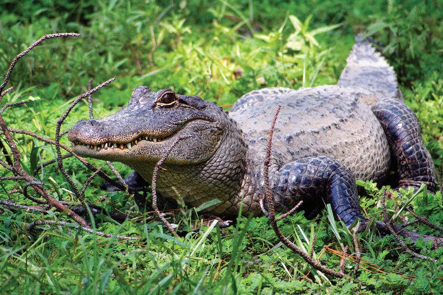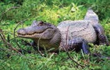 Alligators are reptiles that have dry, leathery skin. Alligators breathe using lungs. They lay eggs with soft, leathery shells and spend most of their time on land.