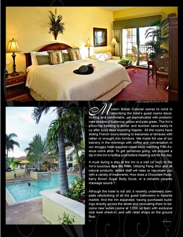odern British Colonial comes to mind in describing the hotel’s guest rooms decor. Inviting and comfortable, yet sophisticated with predominate shades of buttercup yellow and pale green. The Inn’s pillow-top bedding is divine, and slumber came easily to us after busy days exploring Naples. All the rooms have sliding French doors leading to balconies or terraces with rattan or wrought iron furniture. We made full use of our balcony in the mornings with coffee and conversation in our snuggly hotel-supplied robes while watching Fifth Avenue come alive. To get ourselves going, we enjoyed a dip in the Inn’s rooftop pool before heading out for the day. A must during a stay at the Inn is a visit (or two!) to the Inn’s luxurious Spa On Fifth. Utilizing Feng Shui and all natural products, skilled staff will relax or rejuvinate you with a variety of treatments. How does a Chocolate Raspberry Brown Sugar Body Scrub, or a romantic couples massage sound‑? Athough the hotel is not old, it recently underwent complete refurbishing of all the guest bathrooms in Italiante marble. And the Inn expanded, having purchased buildings directly across the street and renovating them to become new suites (some at 1,000 sq feet) with exclusive club level check-in, and with retail shops on the ground floor. ‑‑ ddd 100