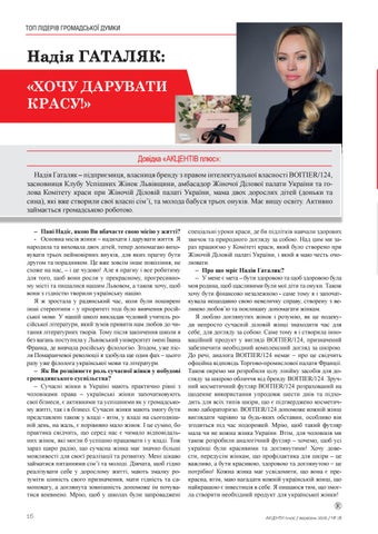 Довідка «АКЦЕНТІВ плюс»: Надія Гаталяк – підприємиця, власниця бренду з правом інтелектуальної власності BOITIER/124, засновниця Клубу Успішних Жінок Львівщини, амбасадор Жіночої Ділової палати України та голова Комітету краси при Жіночій Діловій палаті України, мама двох дорослих дітей (доньки та сина), які вже створили свої власні сім’ї, та молода бабуся трьох онуків. Має вищу освіту. Активно займається громадською роботою. – Пані Надіє, якою Ви вбачаєте свою місію у житті? - Основна місія жінки – надихати і дарувати життя. Я народила та виховала двох дітей, тепер допомагаю виховувати трьох неймовірних внуків, для яких прагну бути другом та порадником. Це вже зовсім інше покоління, не схоже на нас, – і це чудово! Але я прагну і все робитиму для того, щоб вони росли у прекрасному, прогресивному місті та пишалися нашим Львовом, а також хочу, щоб вони з гідністю творили українську націю. Я ж зростала у радянський час, коли були поширені інші стереотипи - у пріоритеті тоді було вивчення російської мови. У нашій школі викладав чудовий учитель російської літератури, який зумів привити нам любов до читання літературних творів. Тому після закінчення школи я без вагань поступила у Львівський університет імені Івана Франка, де вивчала російську філологію. Згодом, уже після Помаранчевої революції я здобула ще один фах – цього разу уже філолога української мови та літератури. – Як Ви розцінюєте роль сучасної жінки у побудові громадянського суспільства? – Сучасні жінки в Україні мають практично рівні з чоловіками права – українські жінки започатковують свої бізнеси, є активними та успішними як у громадському житті, так і в бізнесі. Сучасні жінки мають змогу бути представлені також у владі - втім, у владі на сьогоднішній день, на жаль, є порівняно мало жінок. І це сумно, бо практика свідчить, що серед нас є чимало відповідальних жінок, які могли б успішно працювати і у владі. Тож зараз щиро радію, що сучасна жінка має значно більші можливості для своєї реалізації та розвитку. Мені цікаво займатися питаннями сім’ї та молоді. Дівчата, щоб гідно реалізувати себе у дорослому житті, мають змалку розуміти цінність свого призначення, мати гідність та самоповагу, а доглянута зовнішність допоможе їм почуватися впевнено. Мрію, щоб у школах були запроваджені