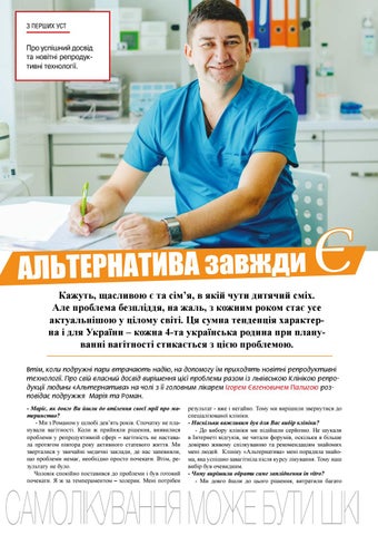 Втім, коли подружні пари втрачають надію, на допомогу їм приходять новітні репродуктивні технології. Про свій власний досвід вирішення цієї проблеми разом із львівською Клінікою репродукції людини «Альтернатива» на чолі з її головним лікарем Ігорем Євгеновичем Палигою розповідає подружжя Марія та Роман. - Маріє, як довго Ви йшли до втілення своєї мрії про материнство? - Ми з Романом у шлюбі дев’ять років. Спочатку не планували вагітності. Коли ж прийняли рішення, виявилися проблеми у репродуктивній сфері – вагітність не наставала протягом півтора року активного статевого життя. Ми зверталися у звичайні медичні заклади, де нас запевняли, що проблеми немає, необхідно просто почекати. Втім, результату не було. Чоловік спокійно поставився до проблеми і був готовий почекати. Я ж за темпераментом – холерик. Мені потрібен