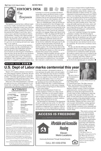 Cartoonist Distribution Scott Adams S. C. Distribution Editorial submissions and news releases on topics of interest to persons with disabilities, or persons serving those with disabilities, are welcomed. We reserve the right to edit all submissions. Editorial material does not necessarily reflect the view of the editor/publisher of Access Press. Paid advertising is available at rates ranging from $12 to $28 per column inch, depending on size and frequency of run. Classified ads are $14, plus 65 cents per word over 12 words. Advertising and editorial deadlines are the last day of the month preceding publication, except for employment ads, which are due by the 25th. Access Press is a monthly tabloid newspaper published for persons with disabilities by Access Press, Ltd. Circulation is 11,000, distributed the 10th of each month through more than 200 locations statewide. Approximately 450 copies are mailed directly to individuals, including political, business, institutional and civic leaders. Subscriptions are available for $30/yr. Lowincome, student and bulk subscriptions are available at discounted rates. Application to mail at Periodicals Postage Prices is Pending at the St. Paul, MN 55121 facility. POSTMASTER: Send address changes to Access Press at 161 St. Anthony Ave, Suite 901, St. Paul, MN 55103. Inquiries and address changes should be directed to: Access Press care of The Kelly Inn Offices; 161 St. Anthony Ave; #910; St. Paul, MN 55103; 651-644-2133 Fax: 651-644-2136 email: access@accesspress.org www.accesspress.org