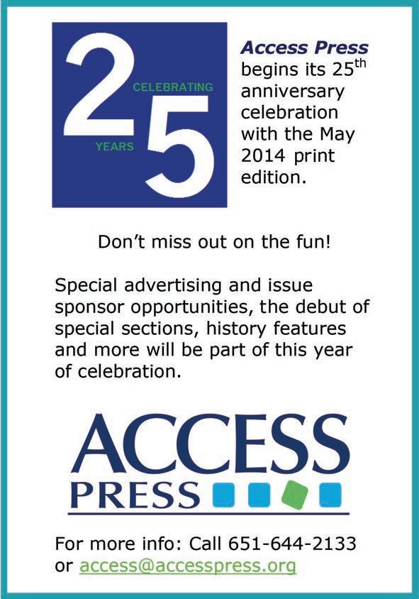 Application to mail at Periodicals Postage Prices is Pending at the St. Paul, MN 55121 facility. POSTMASTER: Send address changes to Access Press at 161 St. Anthony Ave, Suite 901, St. Paul, MN 55103.