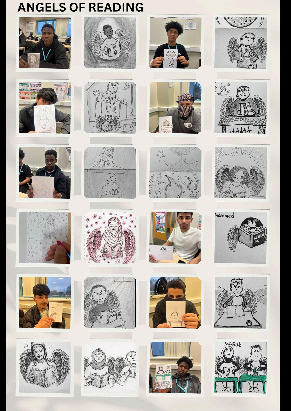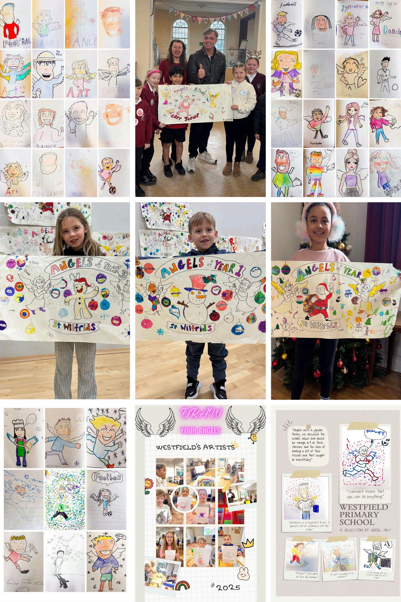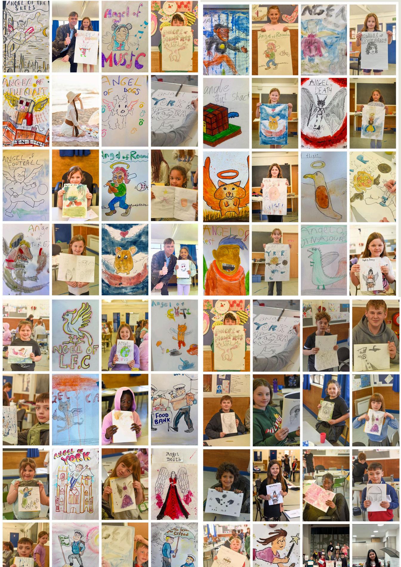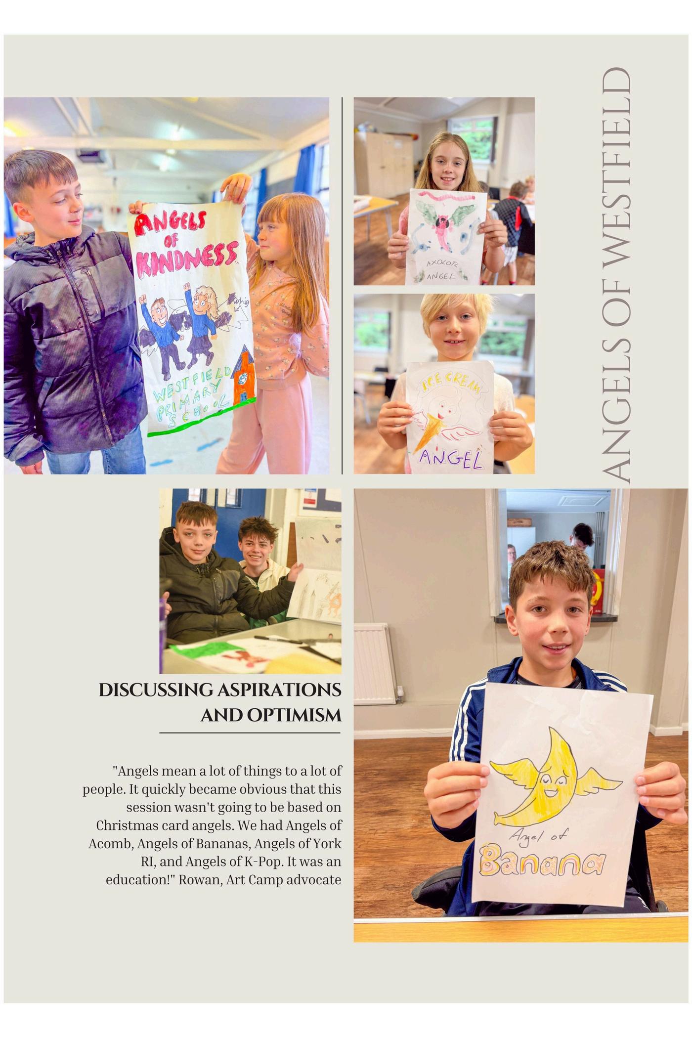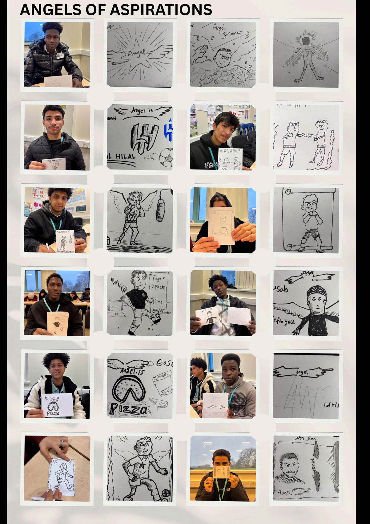Youngartistsapproachedthe conceptofangelsindiverseways Somepreferredtraditional depictions,whileothers reimaginedangelsasfriends, empoweringslogans,beloved celebrities,orpopcultureicons