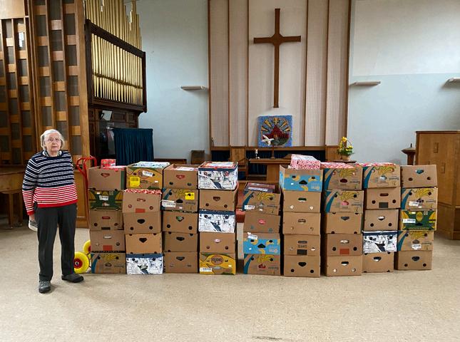 The filled shoebox is then dropped off at Lidgett Methodist Church Mary organises it