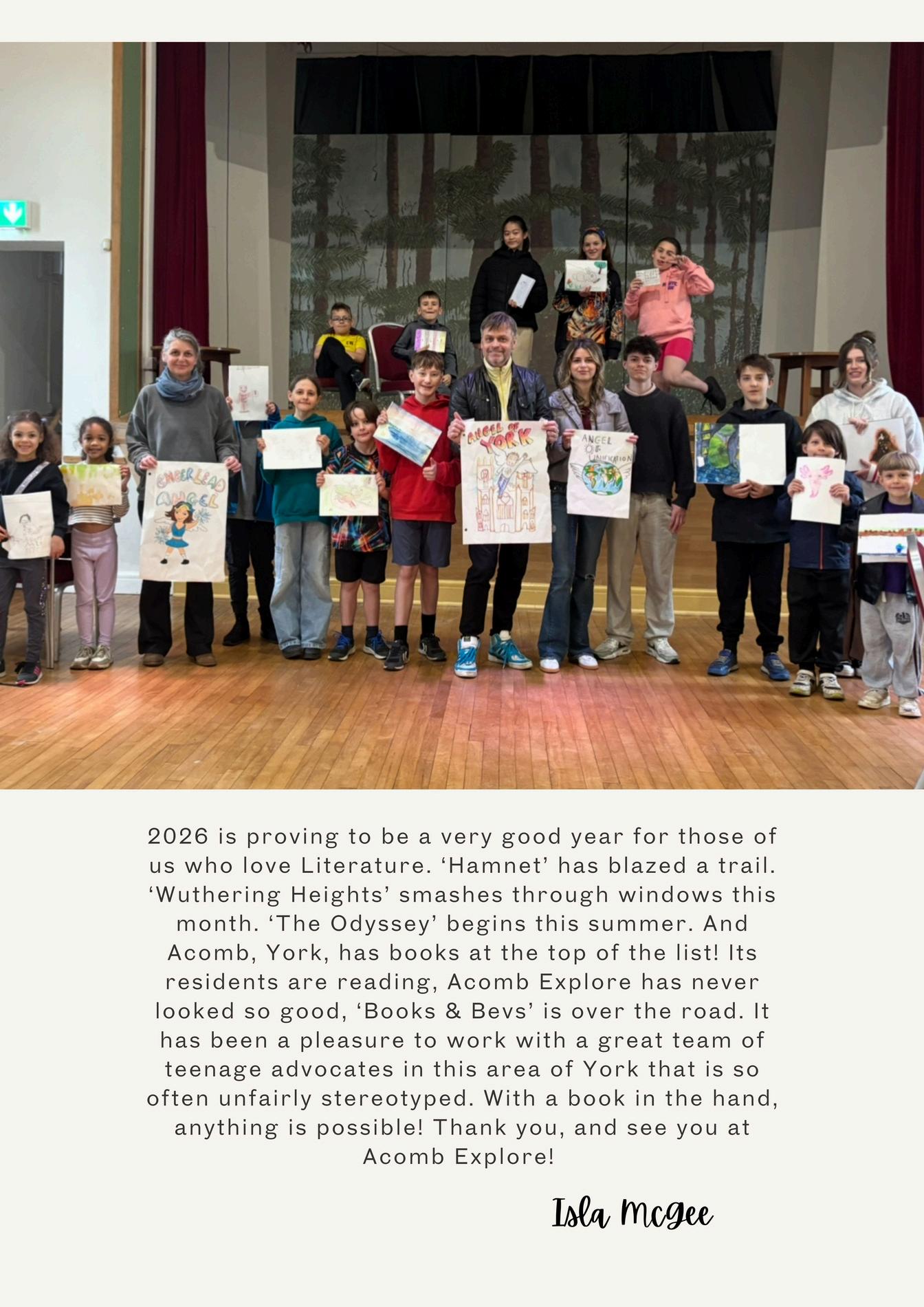 2026 is proving to be a very good year for those of us who love Literature. ‘Hamnet’ has blazed a trail. ‘Wuthering Heights’ smashes through windows this month. ‘The Odyssey’ begins this summer. And Acomb, York, has books at the top of the list! Its residents are reading, Acomb Explore has never looked so good, ‘Books & Bevs’ is over the road. It has been a pleasure to work with a great team of teenage advocates in this area of York that is so often unfairly stereotyped. With a book in the hand, anything is possible! Thank you, and see you at Acomb Explore!