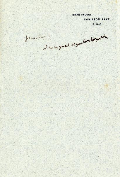 Collingwood came round in the evening and from his manner I gathered that a revulsion of feeling had taken place at Brantwood with regard to the Address and that we should be received by Mr Ruskin. Collingwood said that it had been feared White from the Sheffield Museum was coming with the Address, and Mr Ruskin