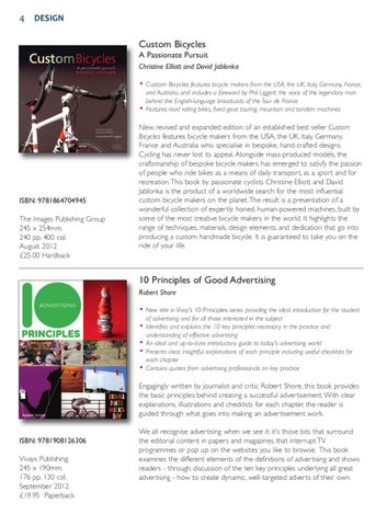 New, revised and expanded edition of an established best seller Custom Bicycles features bicycle makers from the USA, the UK, Italy, Germany, France and Australia who specialise in bespoke, hand-crafted designs. Cycling has never lost its appeal. Alongside mass-produced models, the craftsmanship of bespoke bicycle makers has emerged to satisfy the passion of people who ride bikes as a means of daily transport, as a sport and for recreation. This book by passionate cyclists Christine Elliott and David Jablonka is the product of a worldwide search for the most influential custom bicycle makers on the planet. The result is a presentation of a wonderful collection of expertly honed, human-powered machines, built by some of the most creative bicycle makers in the world. It highlights the range of techniques, materials, design elements, and dedication that go into producing a custom handmade bicycle. It is guaranteed to take you on the ride of your life.