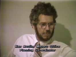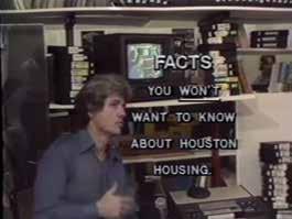 James: "These are video cassettes. There are almost 180 on these shelves, about 75 hours of programming. And in each one someone in Houston has told us something or showed us something about an aspect of the city that is invisible to many of us. Now what I thought that if we could probe through all of this material, finding the pieces and putting them together somehow, we could make the invisible city, visible."