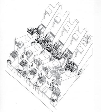 of the neighborhood was an issue from the beginning. During this early phase we postulated at least thirty different housing conditions that represented real choices with dwellings to match. Feedback from prospective users, financial analysis, maintenance, and aesthetic choices all contributed to a refinement of these proposals. Only about twenty of these studies were included in the final housing vocabulary.