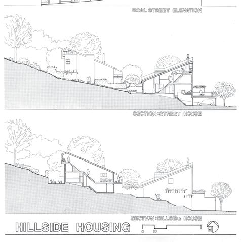 All residents park off the street with their own direct access to their unit. All units also have their own access to a shared park at the top of the site. The houses have a low roof profile in the center with the roof sloping up to the park for upper units and to the city for street-facing units. View corridors are left open for views in both directions.
