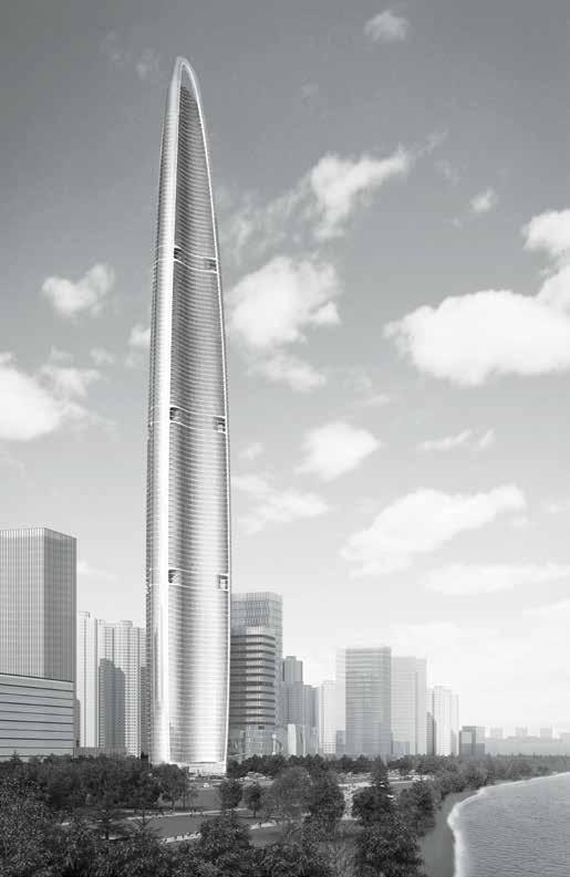 The 119-level tower in Wuhan, China is comprised of about 300,000 sm of floor area, including 200,000 sm of offices, 50,000 sm of luxury apartments and condominiums, a 45,000 sm five-star hotel, and a 5,000 sm 27-meter-tall private club with spectacular views at the tower’s penthouse level.