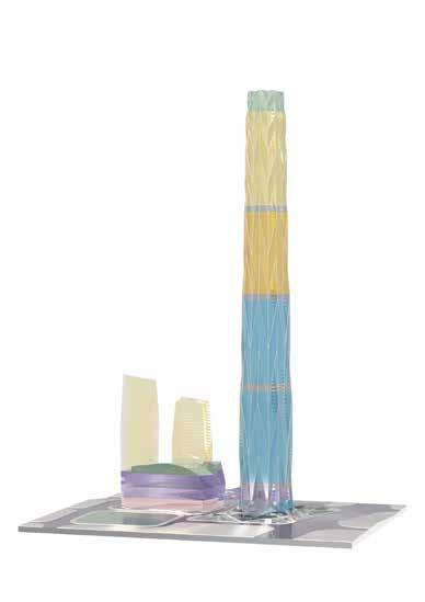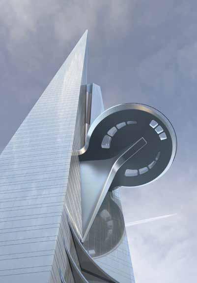 The main tower consists of a 120,000 sm Class A office space in the lower zone, a 51,000 sm luxury hotel in the middle zone, and 42,000 sm of CEO suites in the high zone. Two small towers, at 116 m and 147 m, respectively, accommodate high-end SOHO apartments. The podium includes 14,000 sm of retail, a 16,000 sm conference center with bridge connection to the main tower, and an 8,000 sm exhibition center. There is also a roof garden with 360-degree views of the city.